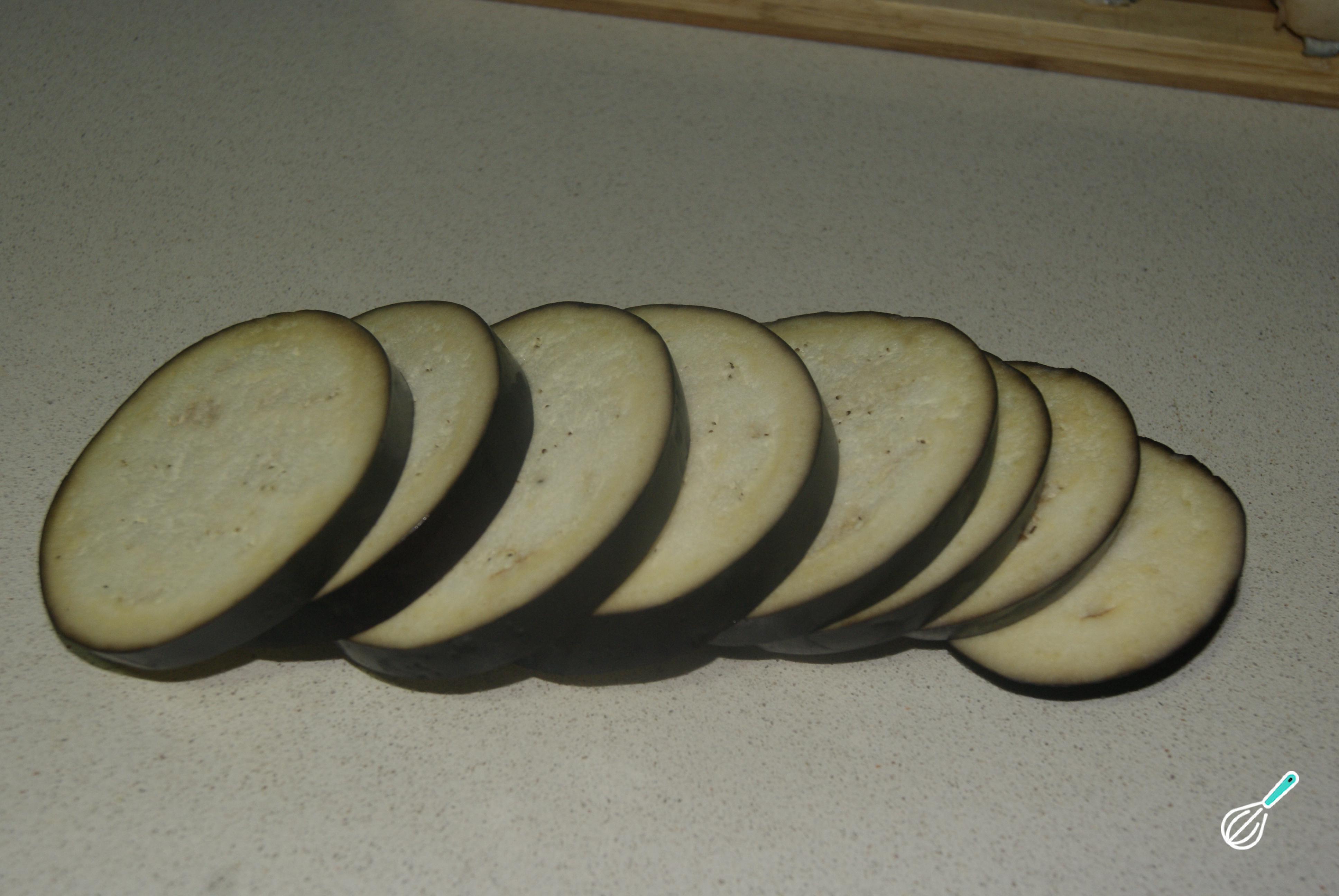 Agora, prepate a berinjela. Lave e corte a berinjela em fatias de cerca de dois centímetros de espessura.