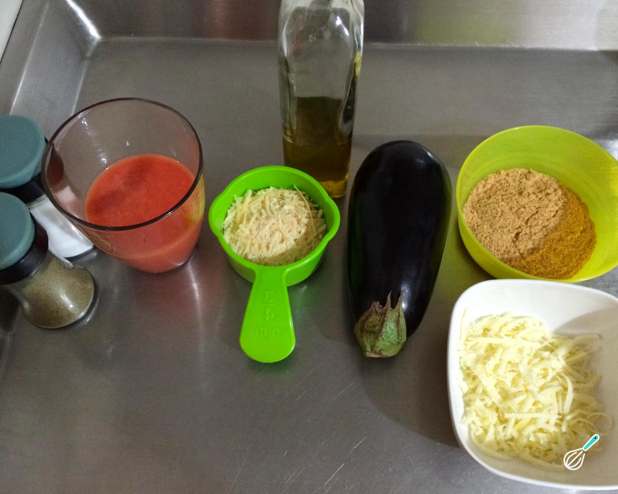 Comece separando todos os ingredientes para prepara a sua berinjela à parmegiana.
