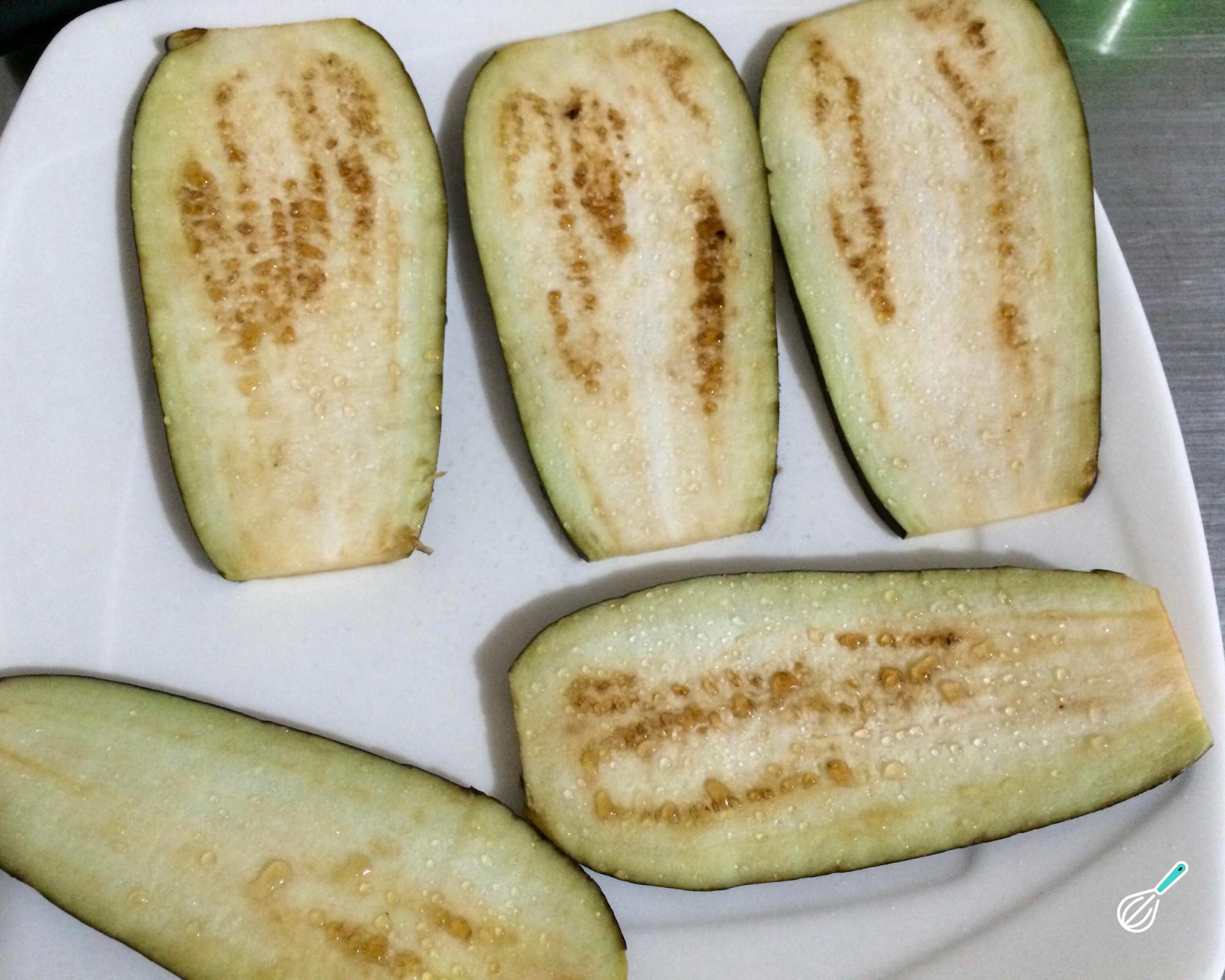 Corte a berinjela no comprimento para obter várias fatias. Polvilhe com sal e reserve por 15 minutos, para eliminar o gosto amargo. Após esse tempo lave as fatias de berinjela com água e seque em papel toalha.