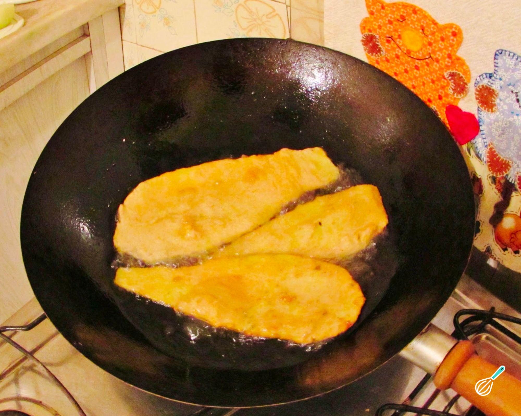 Passe as fatias de berinjela em farinha de rosca e leve para dourar, de ambos os lados, numa frigideira com um pouco de azeite de oliva.