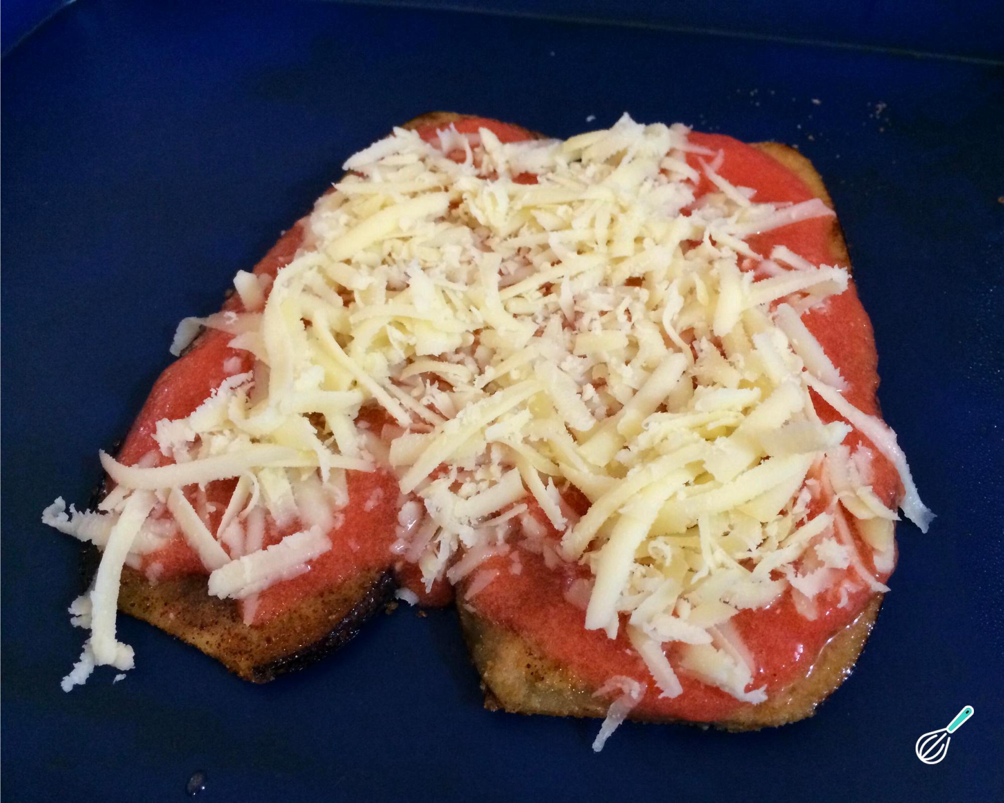 Coloque duas fatias de berinjela numa forma e cubra com o molho de tomate e o queijo mussarela.