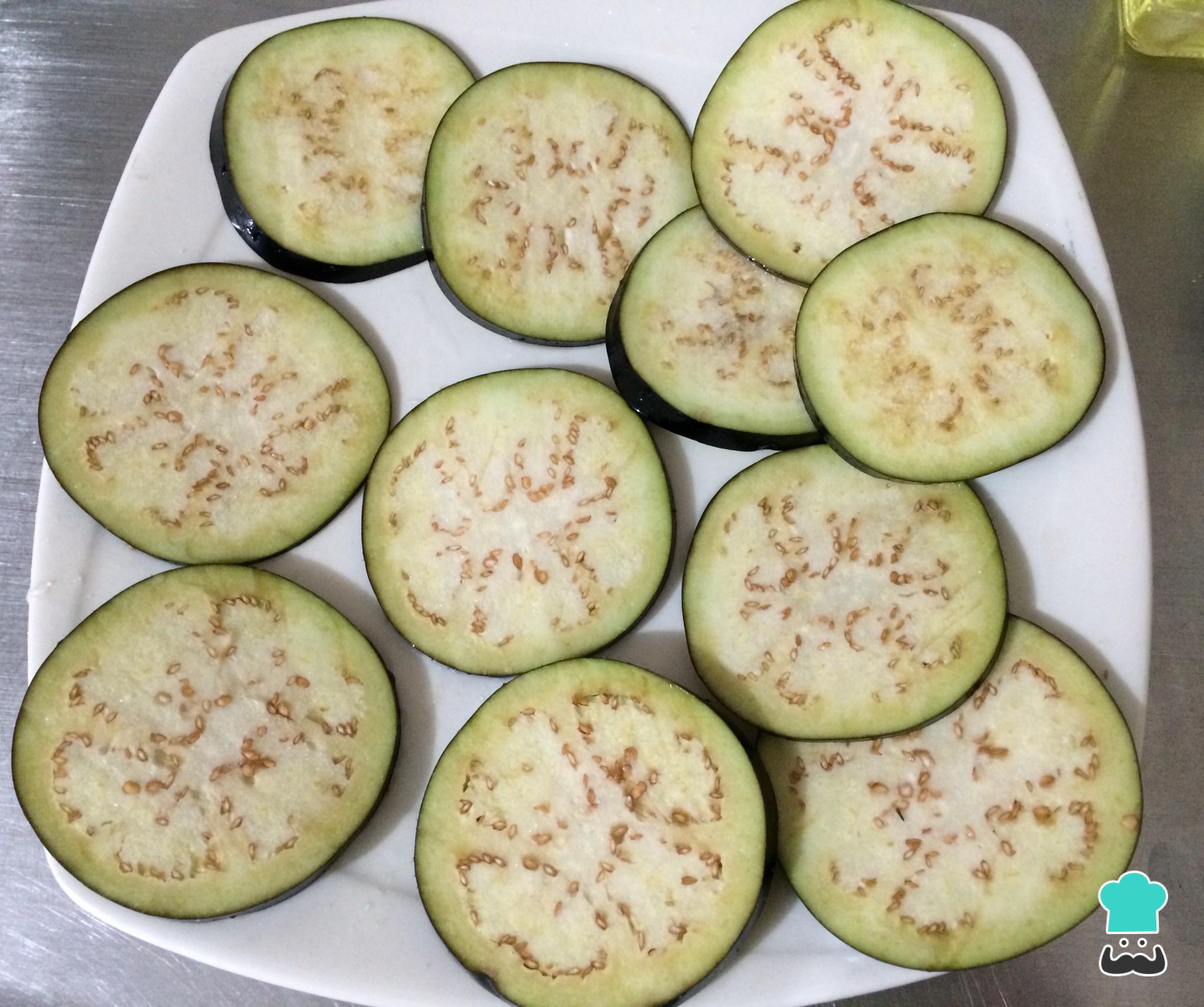 Corte a berinjela em fatias, salpique umas gotas de limão, tempere com sal e pimenta e deixe repousar por 5 minutos.