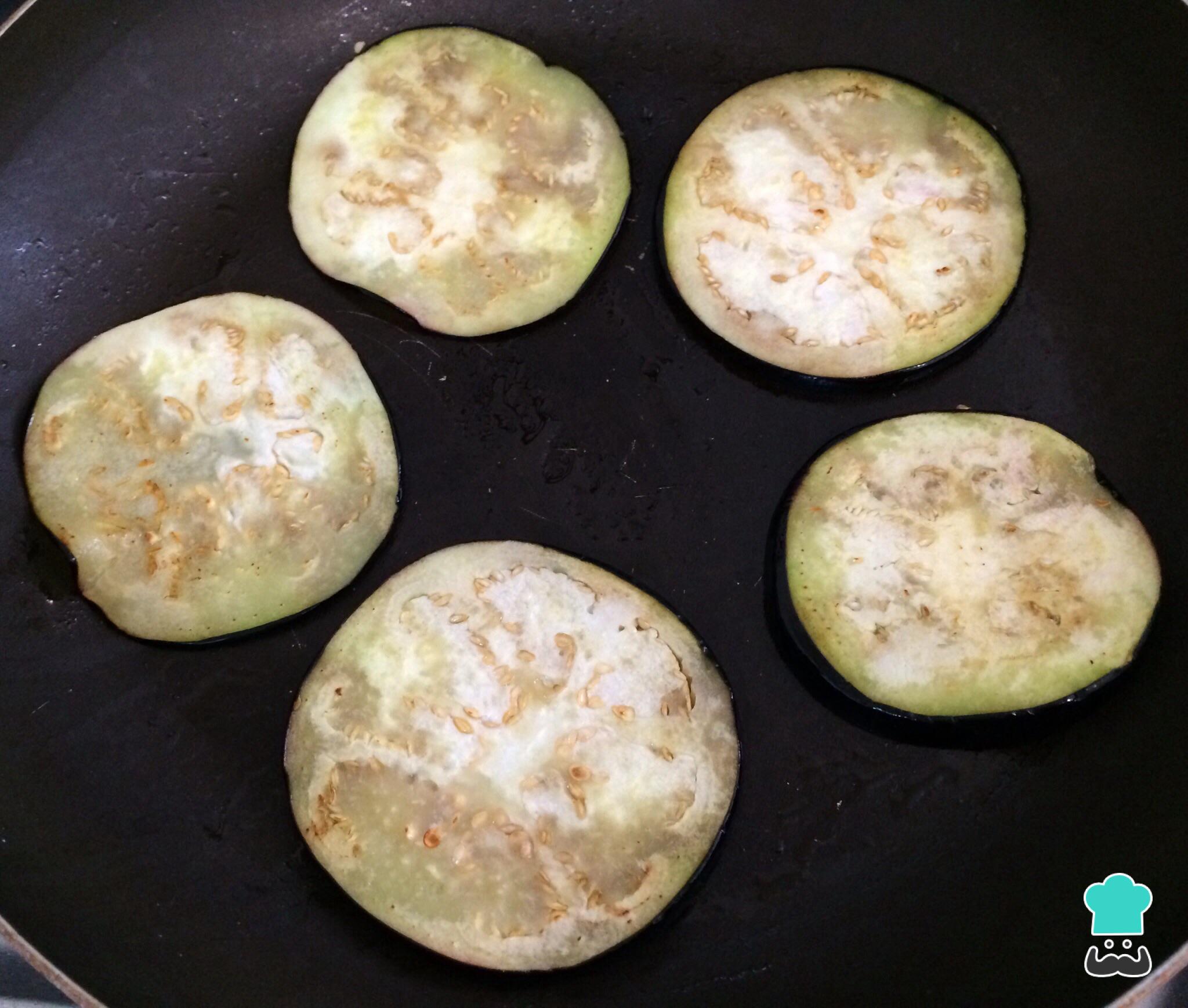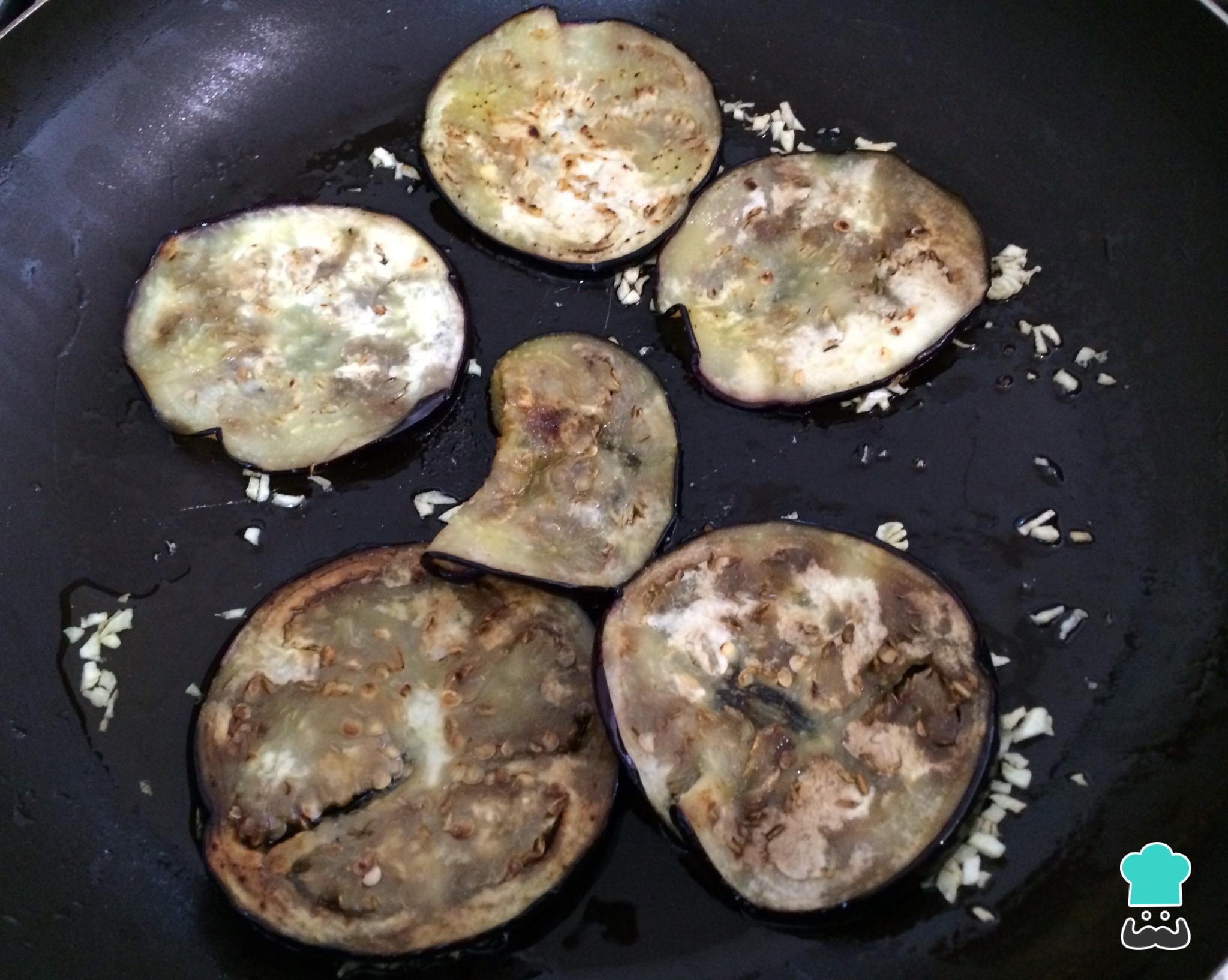O passo seguinte da berinjela ao alho é, em uma frigideira com azeite, dourar as fatias de berinjela de um lado e do outro. Retire e reserve num prato.