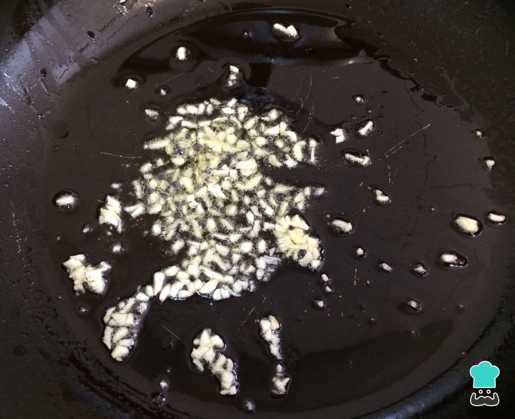 Na mesma frigideira acrescente um pouco de azeite e cozinhe agora o alho finamente cortado, em fogo baixo, por 2 minutos. Mexa para evitar que queime.