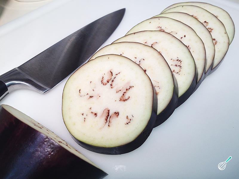 Para fazer berinjela ao forno, comece por cortar o legume em fatias de 1 cm e meio. Mergulhe-as em água e vinagre para que não oxidem com o contacto com o ar.