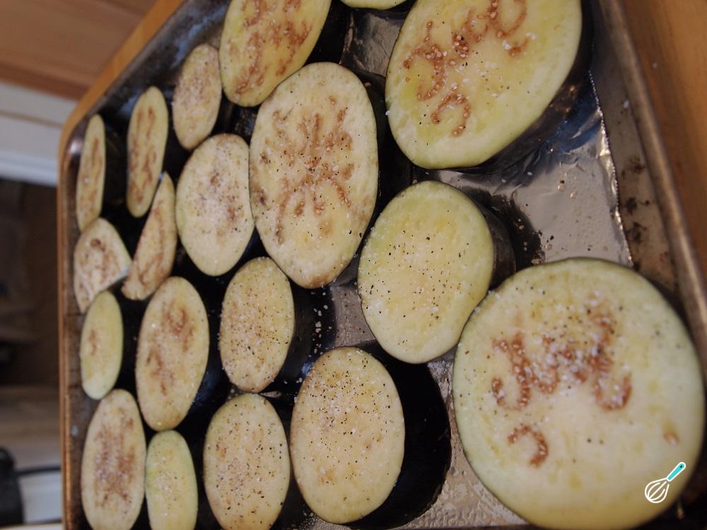 Para continuar com a receita de berinjela com parmesão, escorra e seque as fatias do passo anterior. Em seguida, tempere com sal e pimenta a gosto e deixe repousar.
