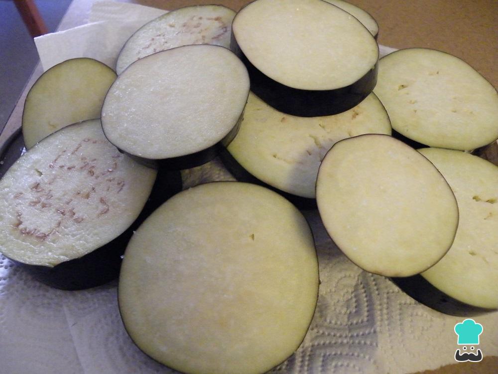Para fazer berinjela gratinada com presunto e queijo, comece por lavar e descascar a berinjela. Corte o legume em fatias grossas, tempere com sal e pimenta e deixe em repouso por 20 minutos.