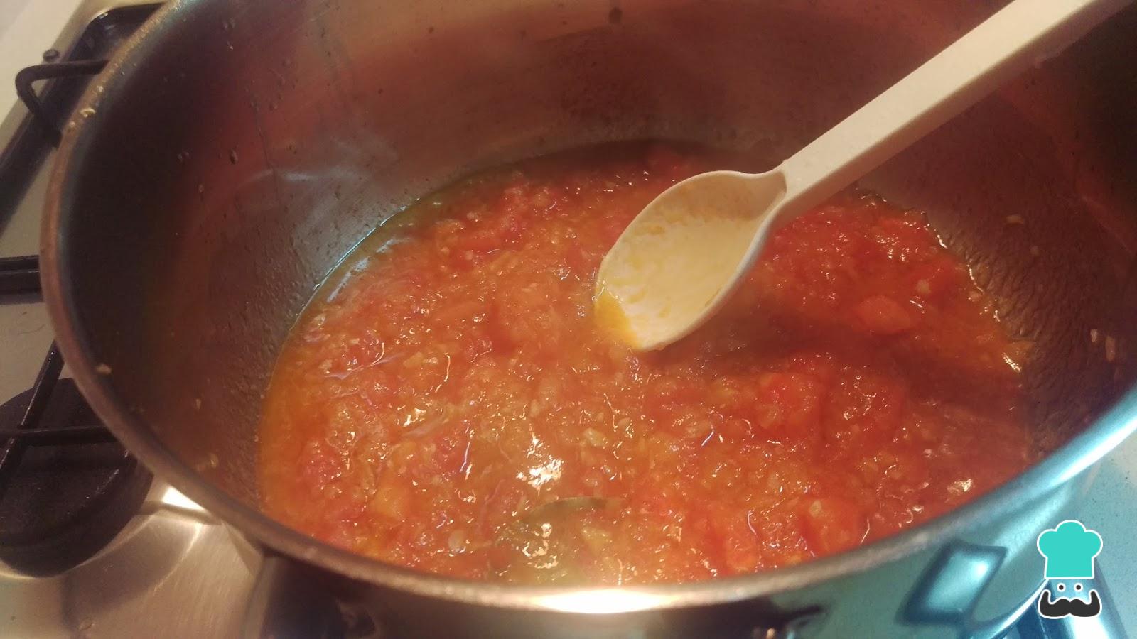 Depois desse tempo, refogue os tomates com o alho em uma panela com azeite. Refogue também o bacon e presunto rapidamente.