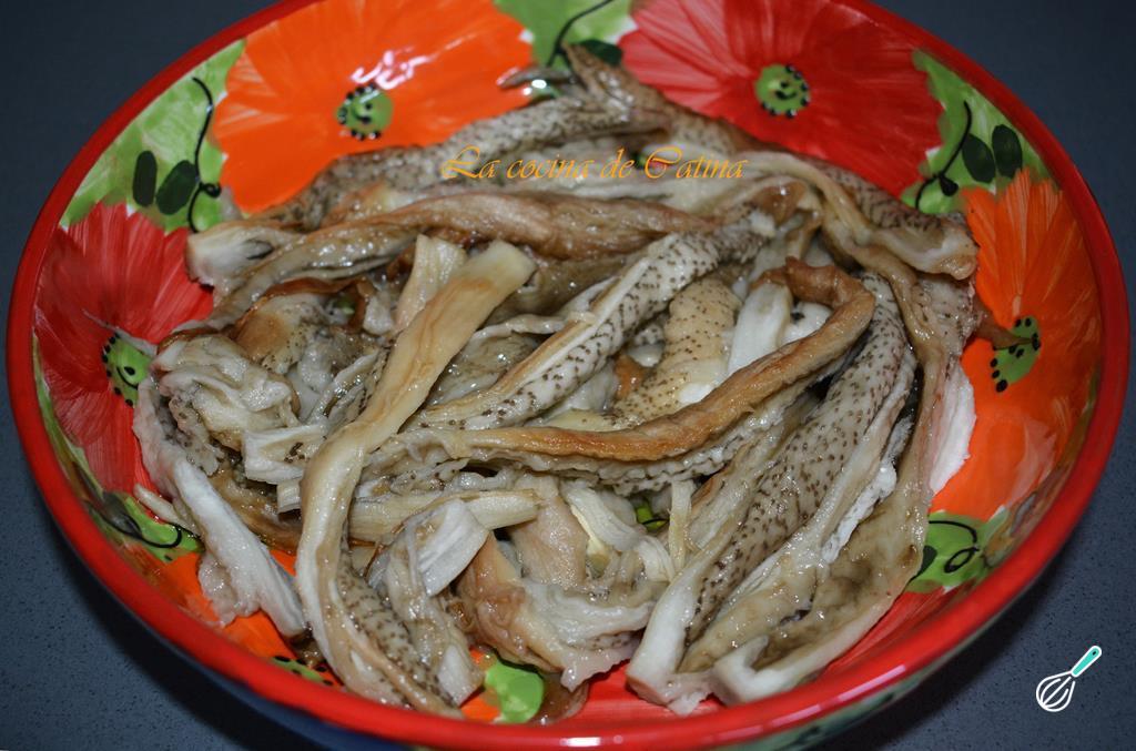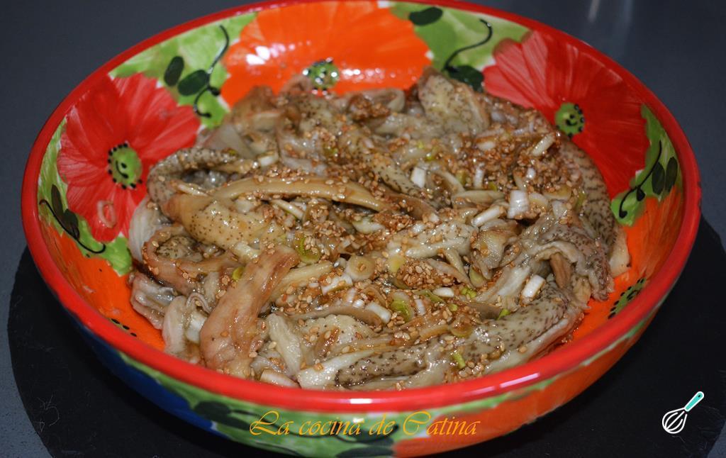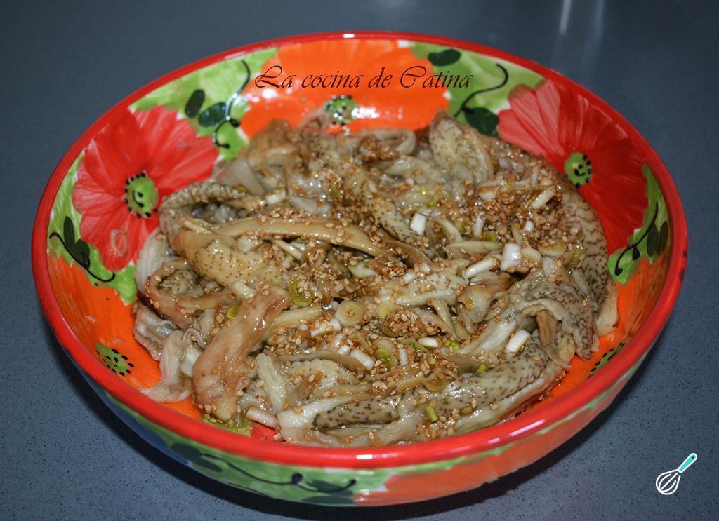 Comece por preparar as berinjelas lavando e retirando a casca. Leve uma panela com água ao fogo para levantar fervura. Quando levantar fervura, coloque as berinjelas numa cesta adequada para cozer a vapor e coloque por cima da água. Deve de se assegurar que a água não toca na cesta. Deixe cozer a vapor por 30 minutos, virando as berinjelas, para que cozam de todos os lados. Retire a cesta e deixe escorrer e esfriar. Depois das berinjelas esfriarem corte em tiras de meio centímetro de altura e deixe que sequem por 20 minutos mais.