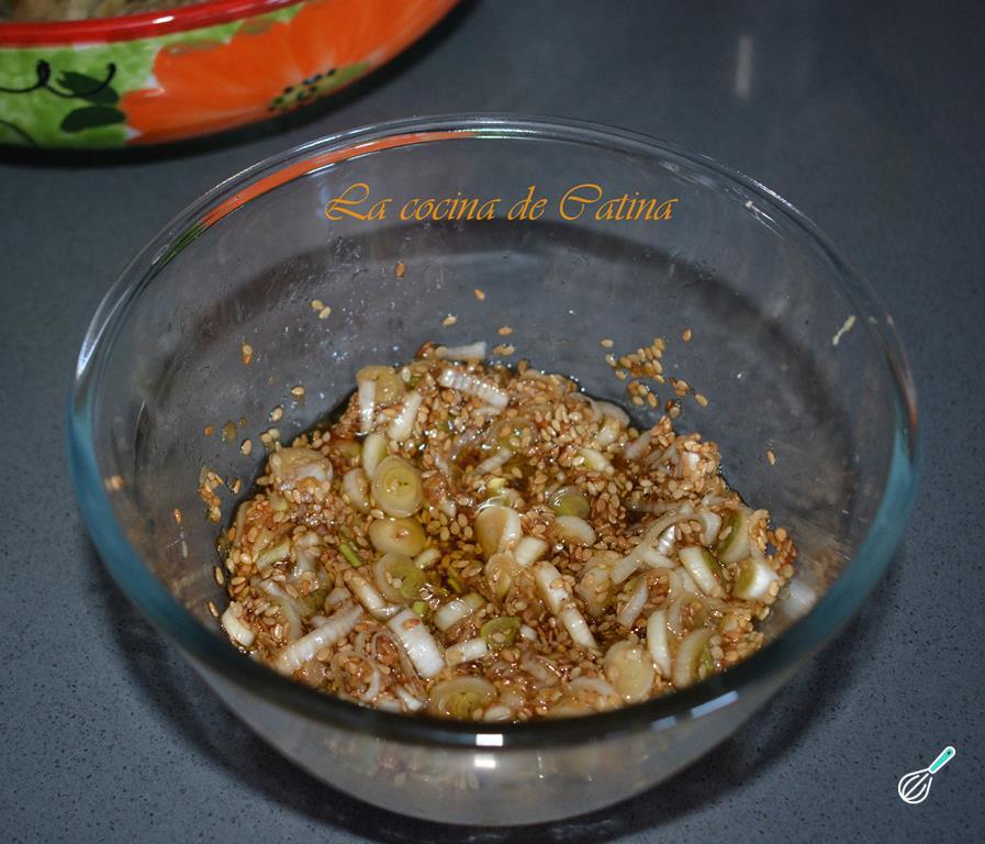 Depois das berinjelas frias, adicione as cebolas cortadas em fatias finas, as sementes de gergelim e misture bem.