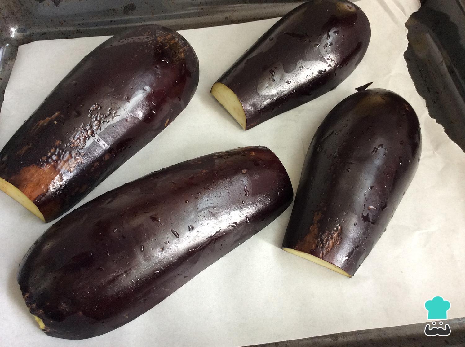 Em seguida prepare as berinjela para assar no forno: corte fora o topo, depois corte em metades e coloque em um tabuleiro de forno com papel manteiga. Leve a assar a 220ºC durante 40 a 45 minutos.