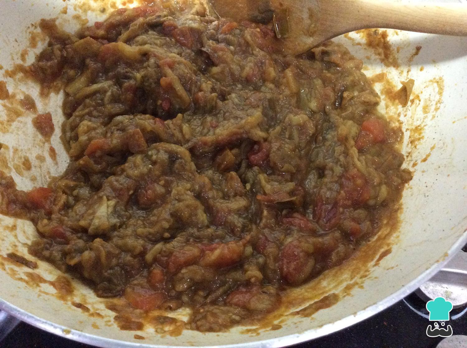 Com a ajuda de uma colher retire a polpa das berinjelas e adicione à panela. Misture bem e, após 4-5 minutos, adicione os restantes ingredientes: o molho de tomate, o açúcar e o sal. Deixe esta receita árabe cozinhar por mais 5 minutos, mexendo de vez em quando para não queimar.
