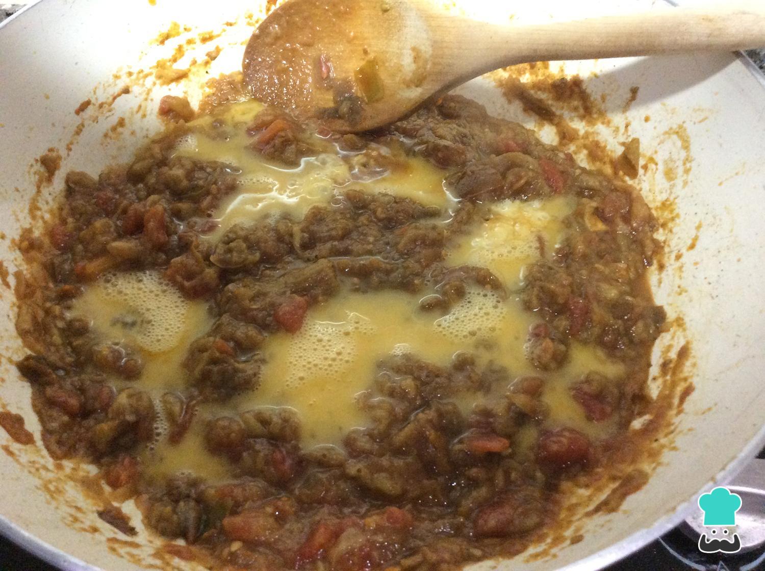 Após o passo anterior bata o ovo a adicione à mistura sem mexer, para que cozinhe assim mesmo. Após cerca de 5 minutos, quando estiver consistente, mexa e desligue o fogo.