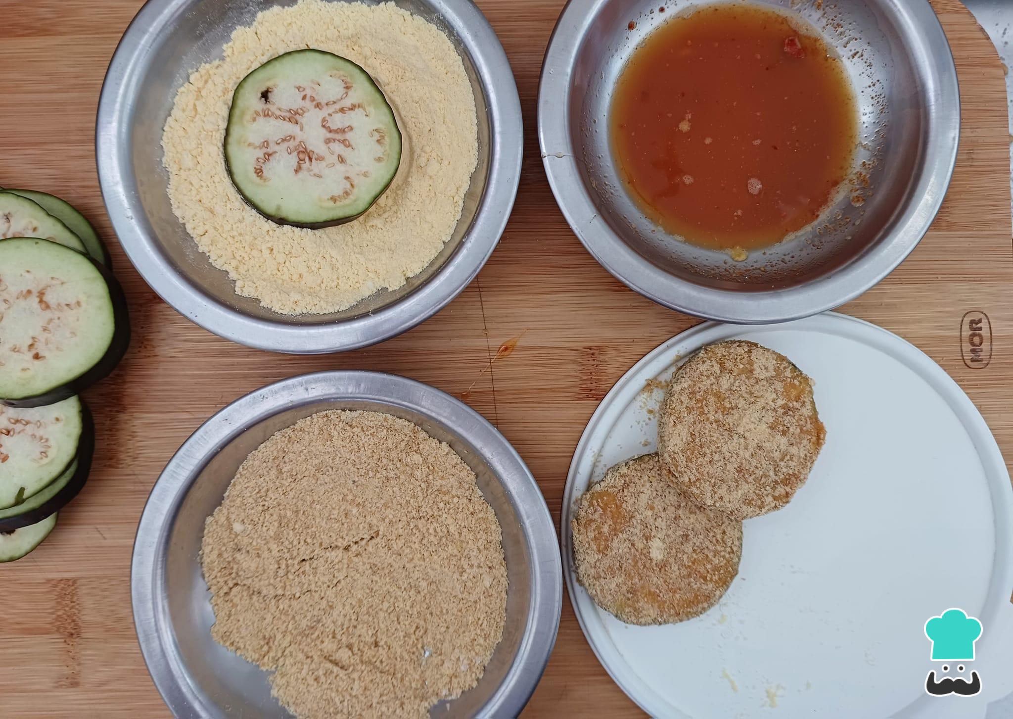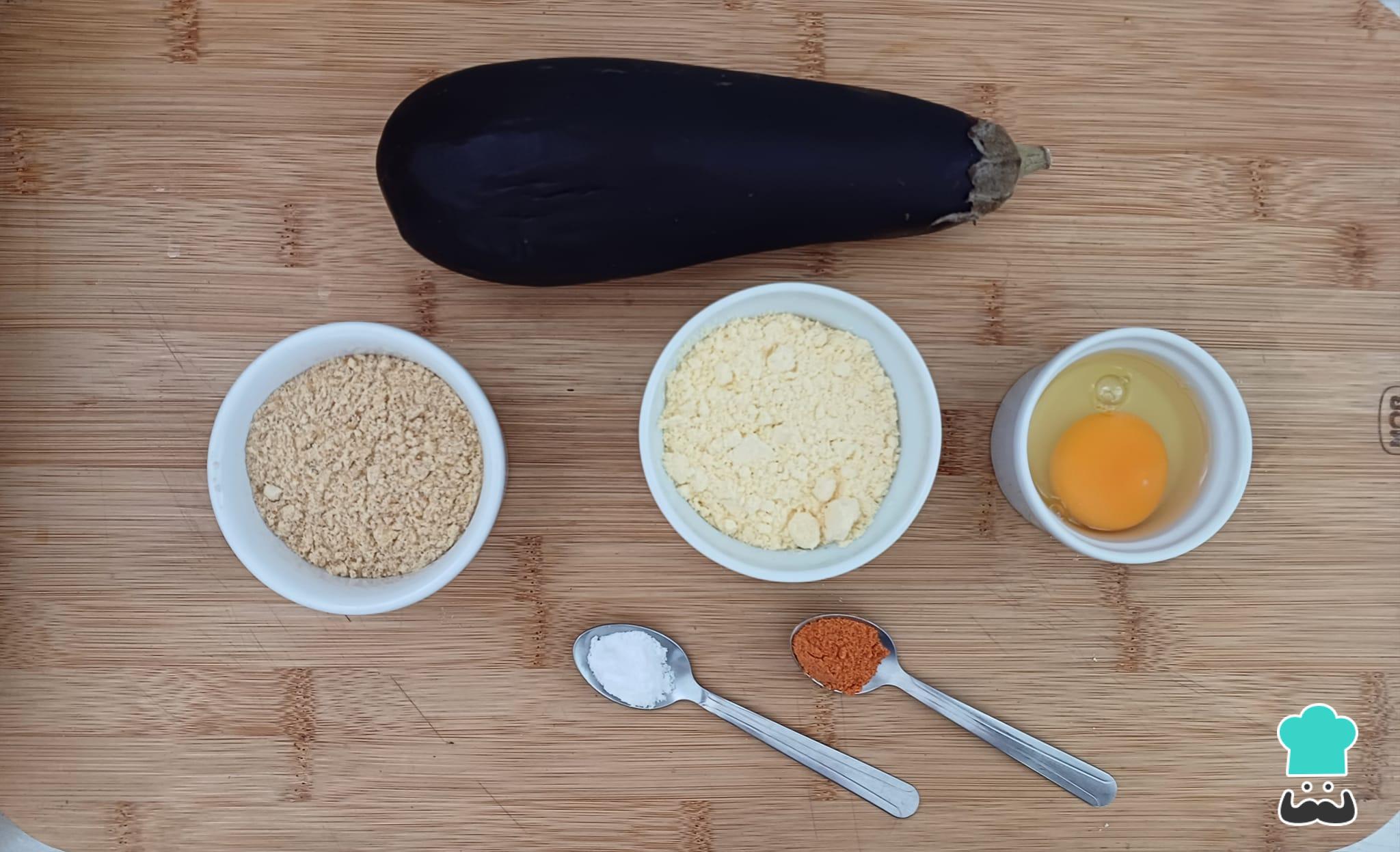 Separe os ingredientes necessários para preparar esta receita de berinjela empanada na air fryer.