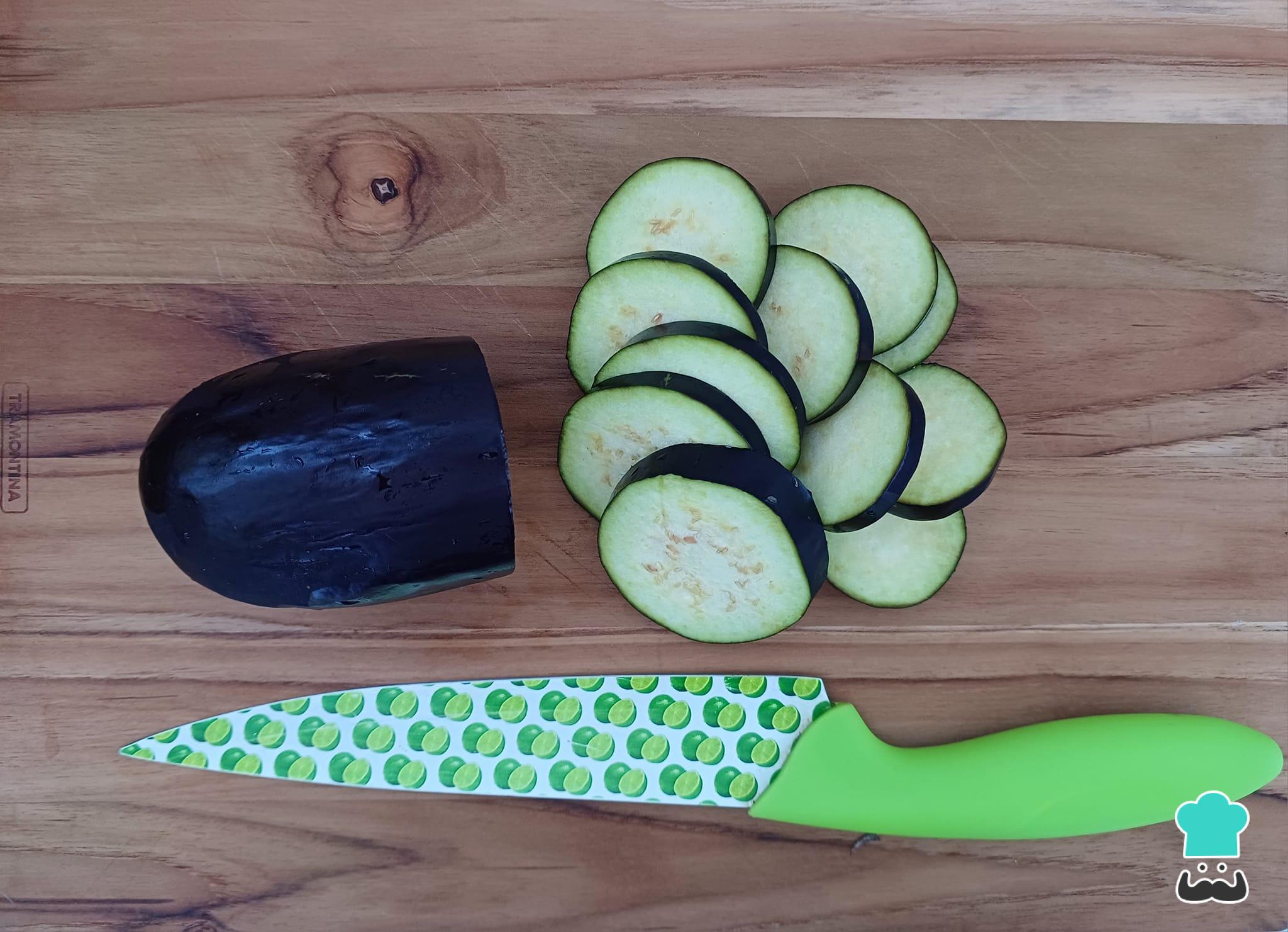 Depois de lavar e higienizar a berinjela, corte-a em fatias com 1 cm de espessura aproximadamente.