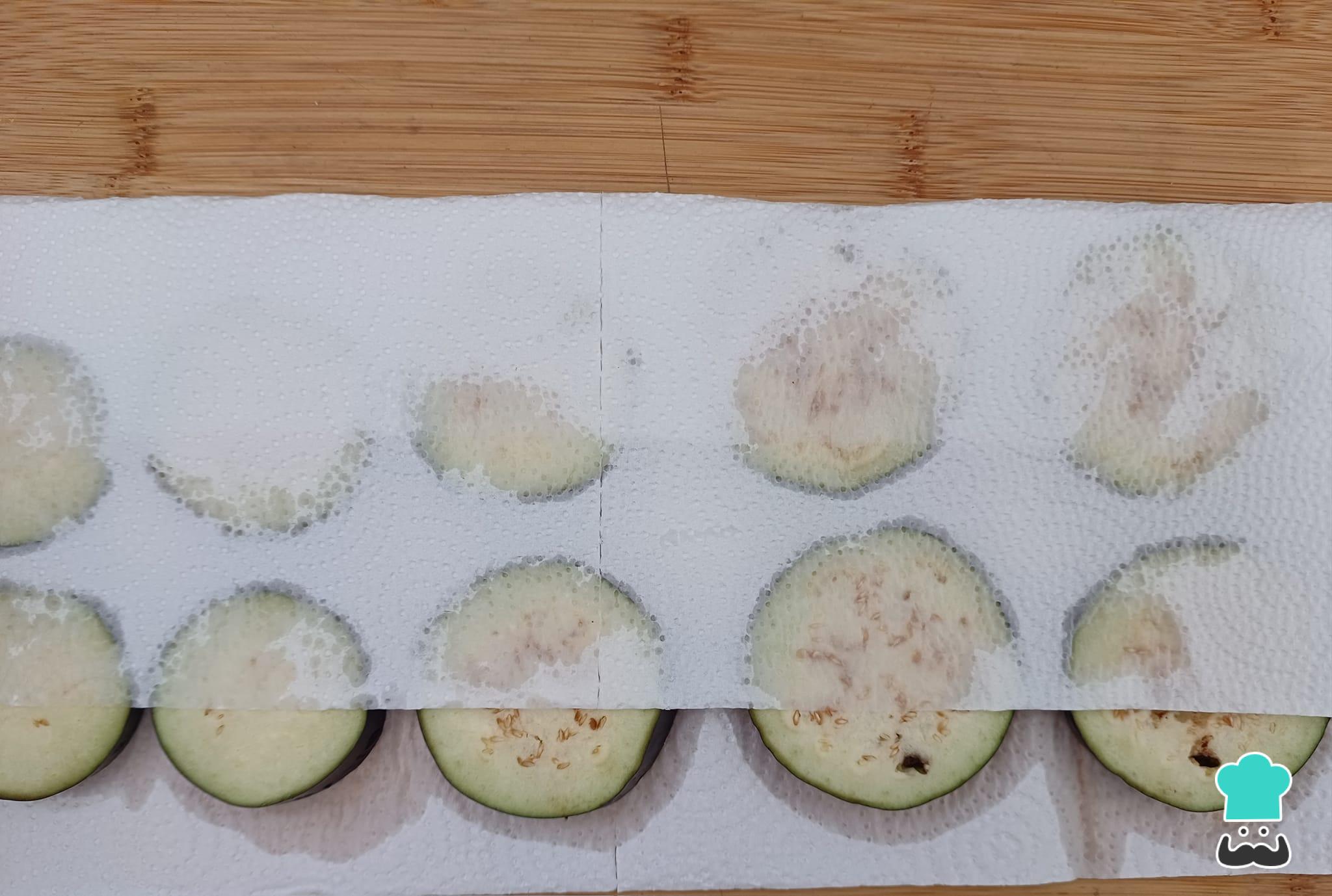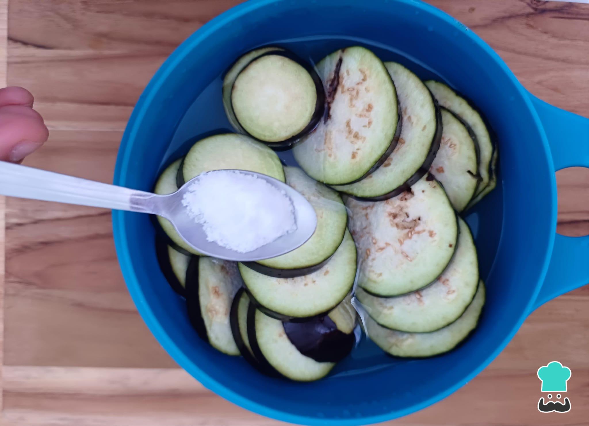 Deixe as rodelas de berinjela de molho numa vasilha com água e sal por cerca de 10 minutos.