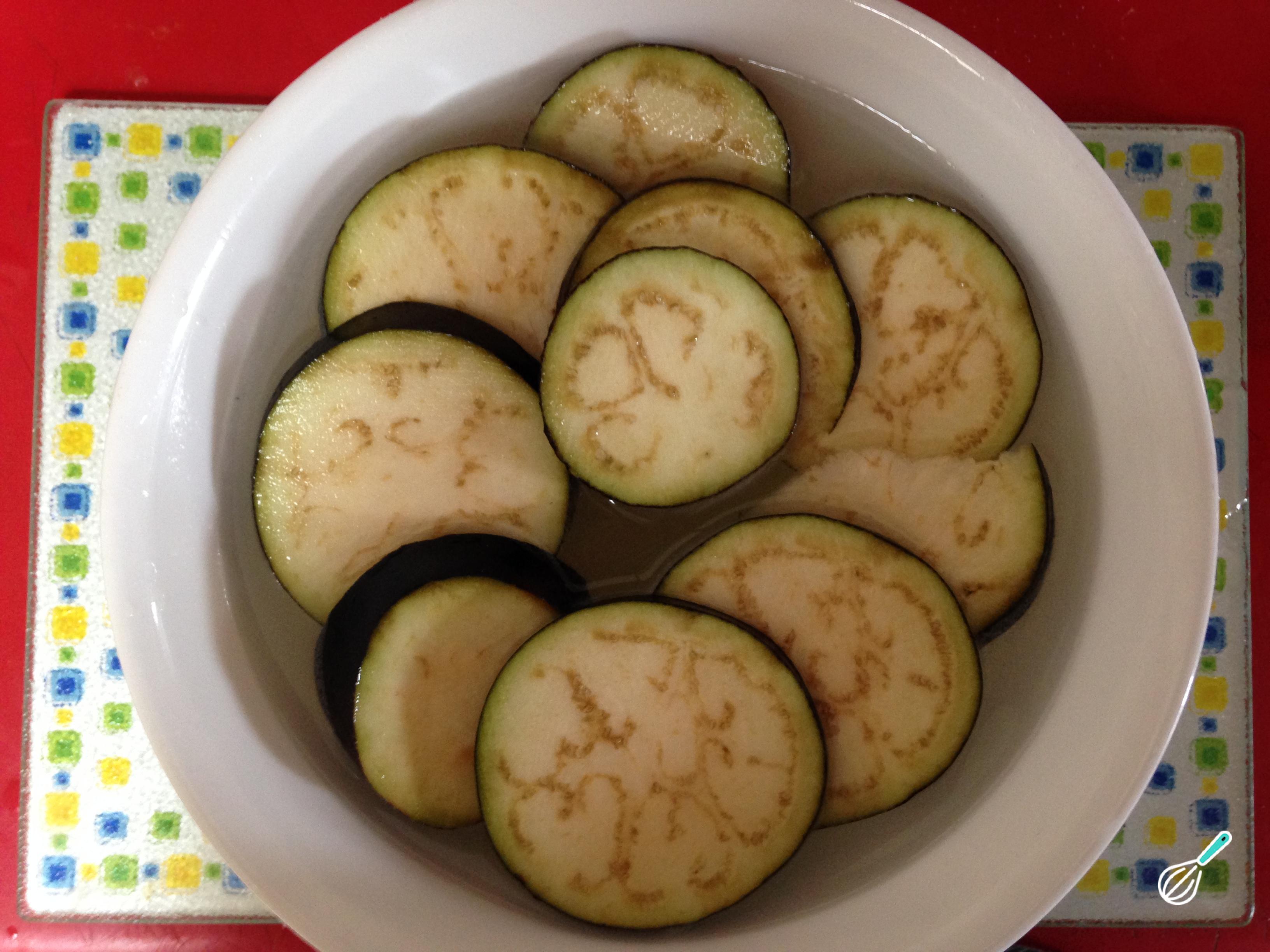 Coloque a berinjela em água com sal abundante durante meia hora. Isso ajudará a reduzir o gosto amargo.