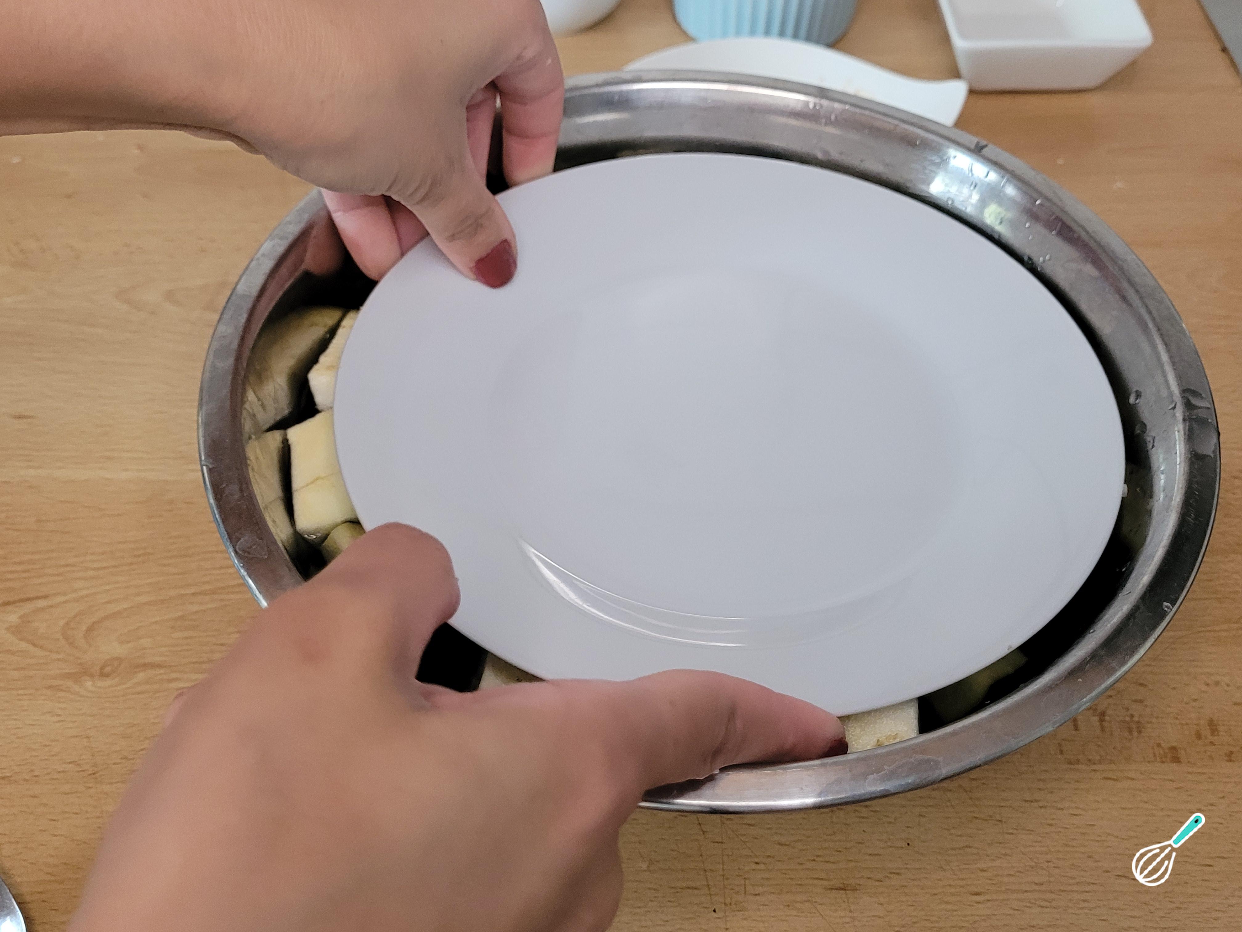 Coloque as berinjelas cortada na água com sal e cubra com um prato ou um peso para garantir que fiquem mergulhadas na água. Deixe por uns 15 minutos.