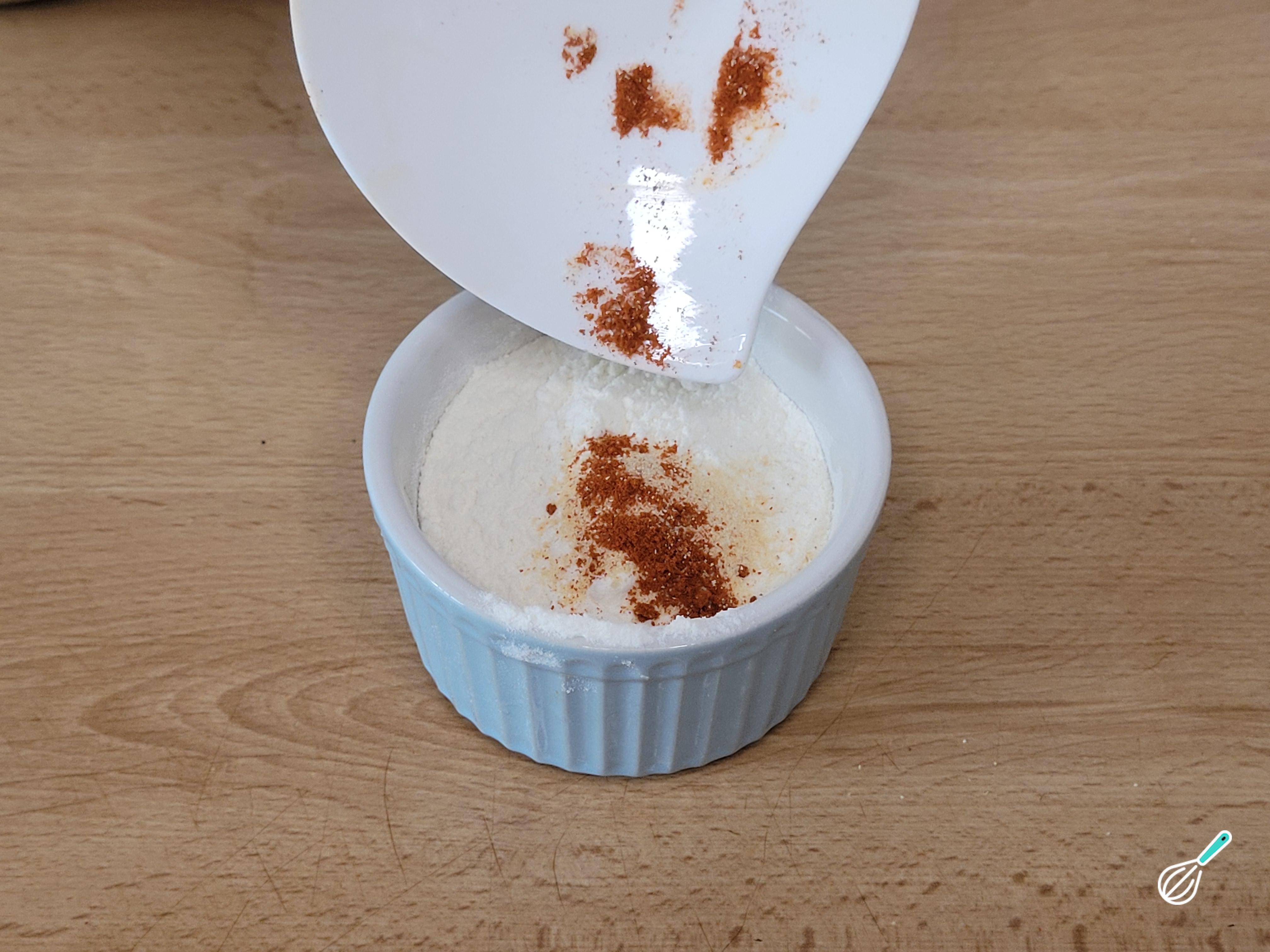 Tempere a farinha de trigo que será usada para empanar as berinjelas como desejar. Eu gosto de adicionar páprica e alho em pó. Isso acrescente mais sabor a receita!