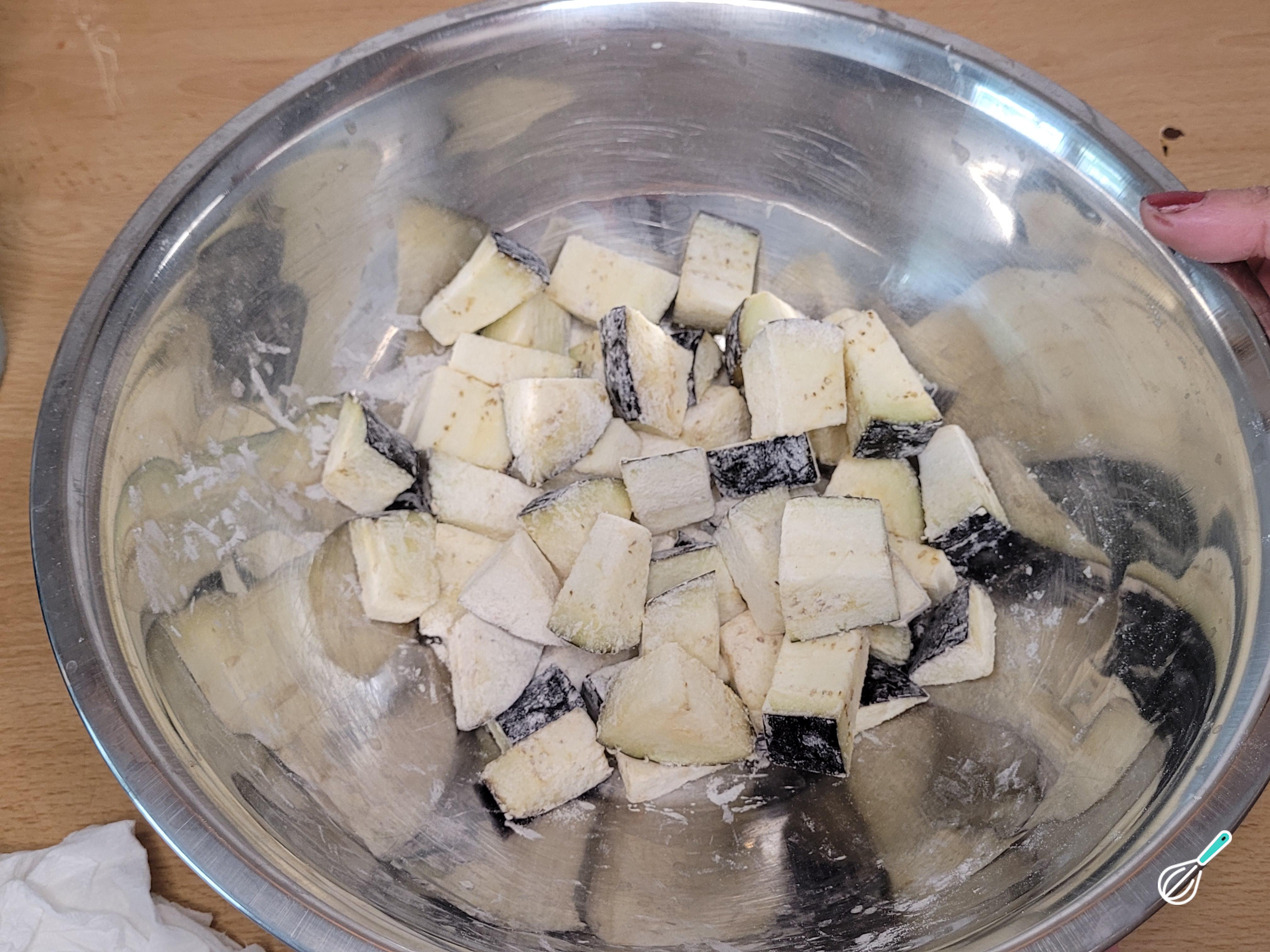 Coloque as berinjelas secas em uma tigela e adicione a farinha de trigo temperada aos poucos, mexendo sempre para envolver todas as berinjelas. A ideia é formar uma camada fina, sem exagerar.