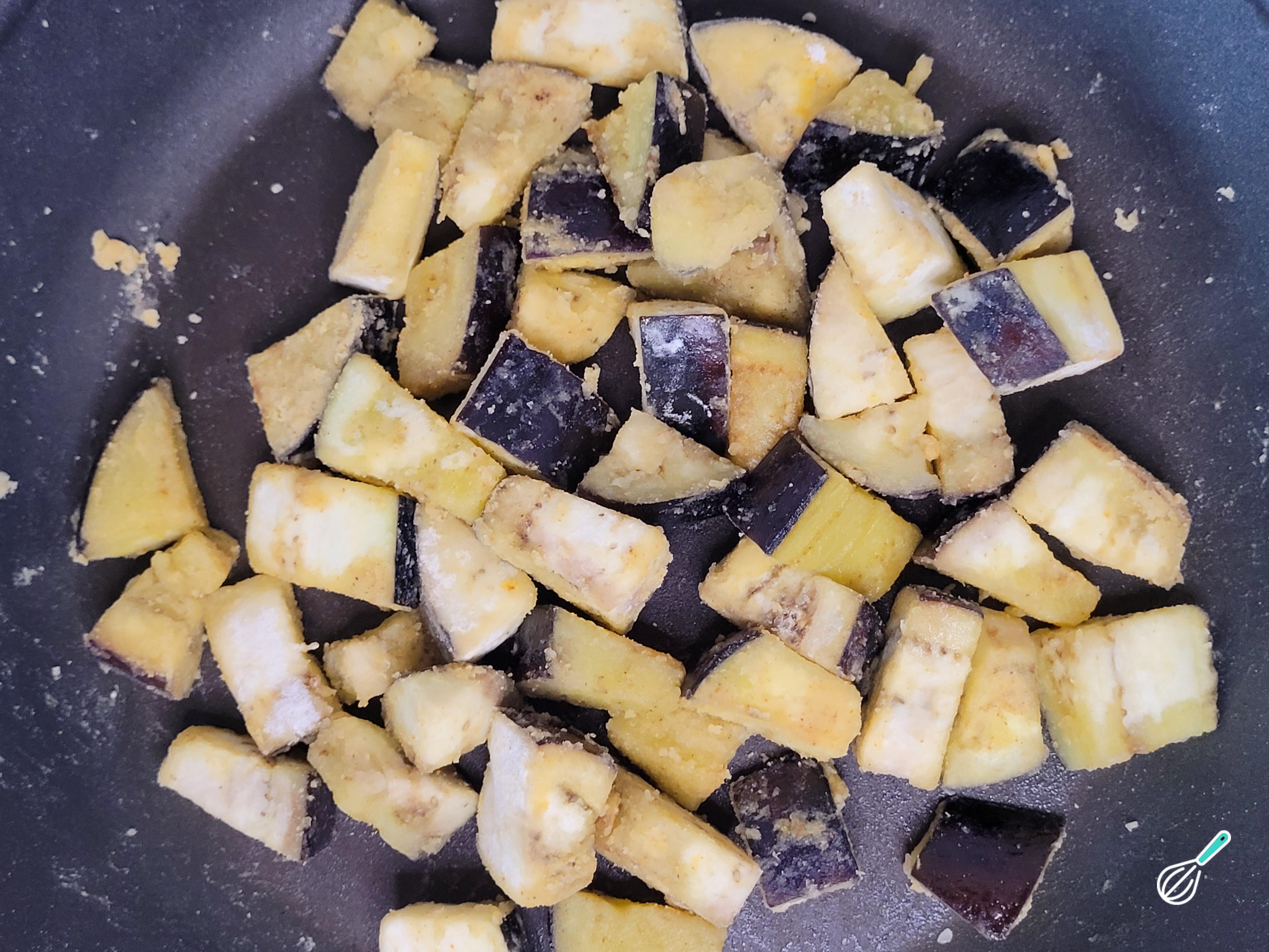 Evite mexer muito no início, deixe que as berinjelas dourem bem de um lado antes de virar. Quando começarem a ficar douradas, vire para que dourem por igual.