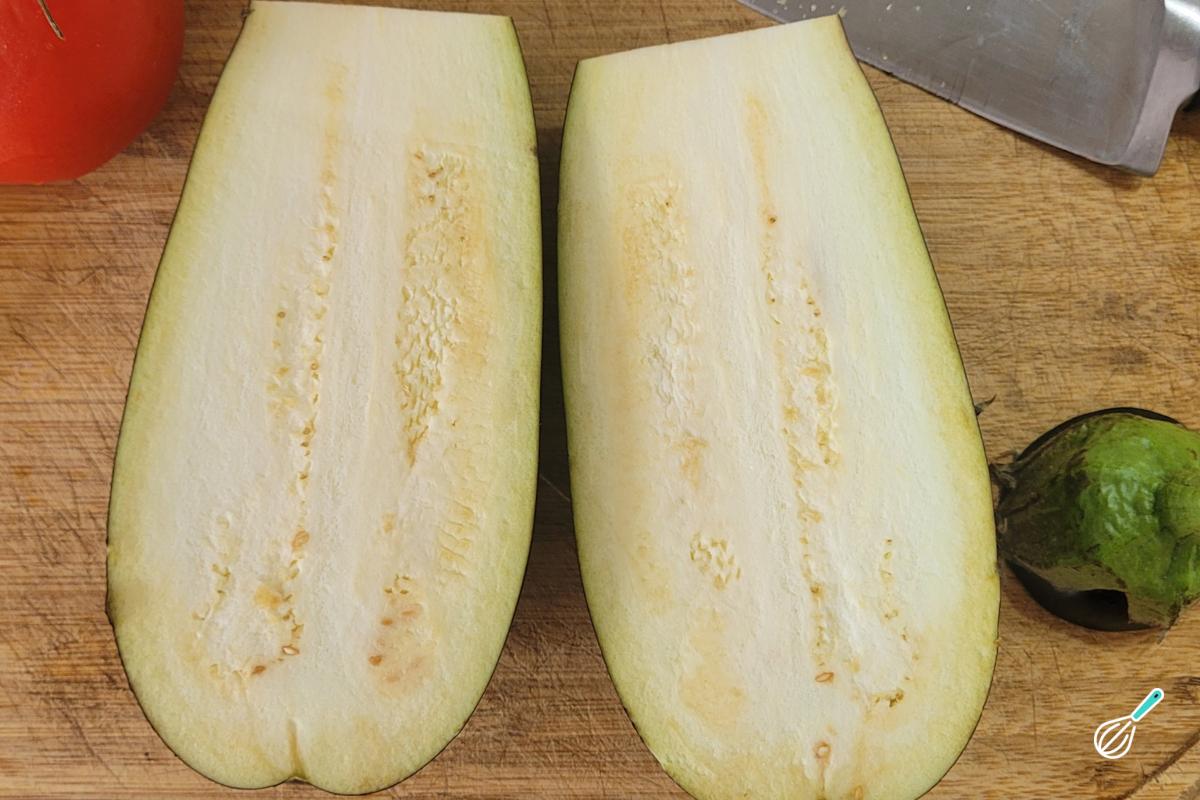 Tire o cabinho da berinjela e corte ao meio na transversal.