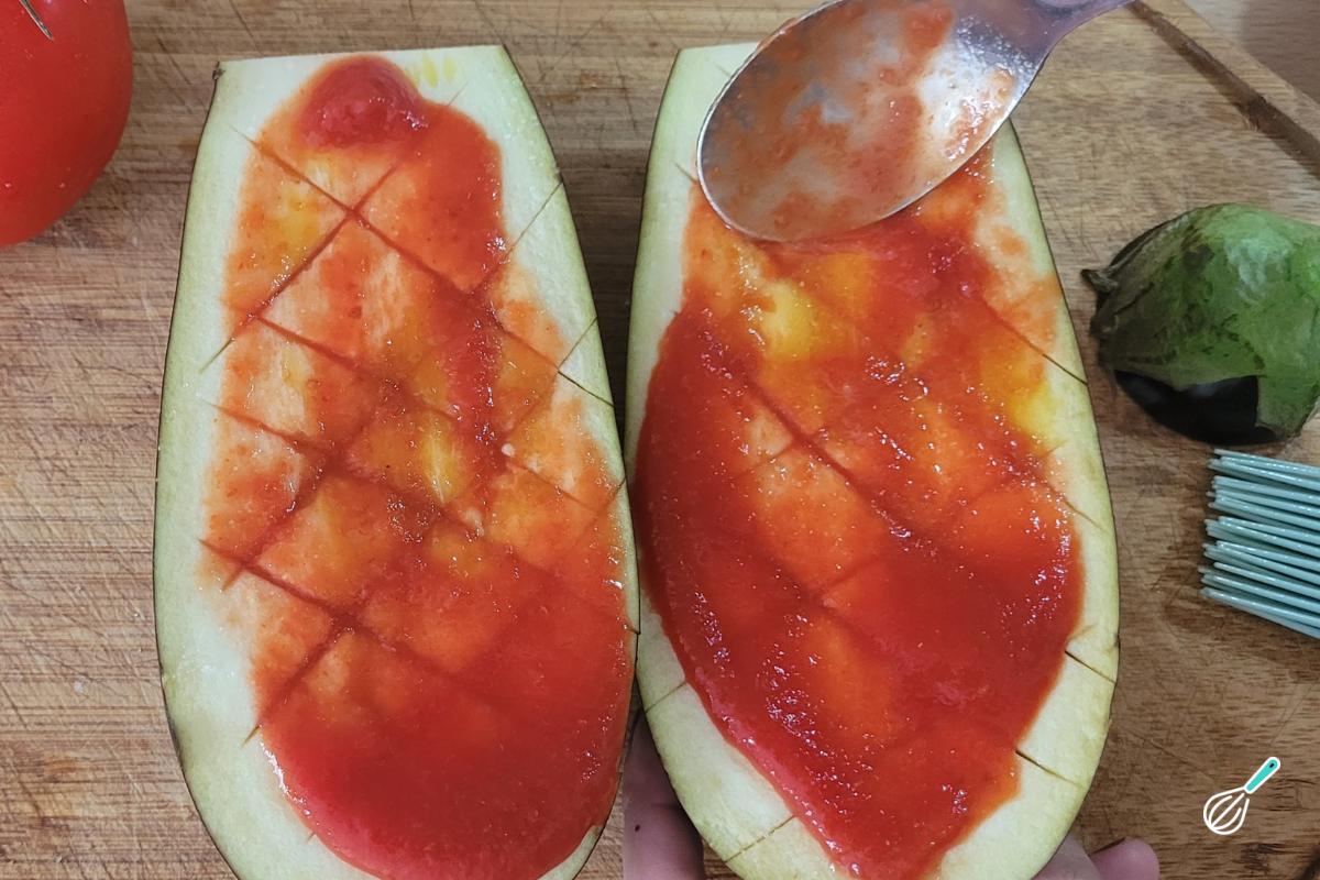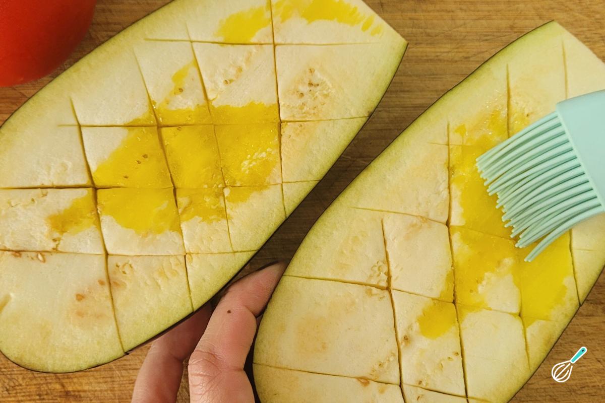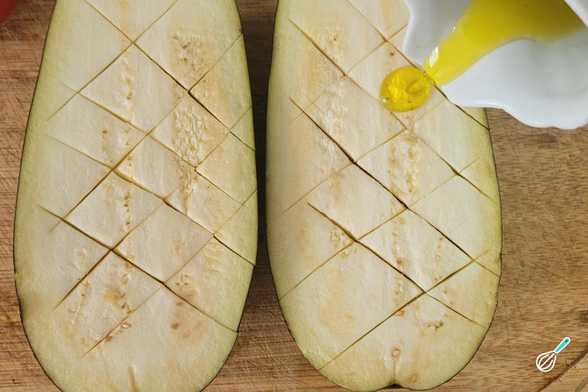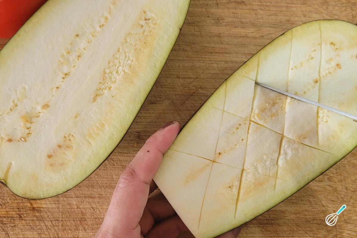 Faça cortes em diagonal nas duas partes. Isso faz com que a berinjela absorva melhor o molho e os sabores e fique mais macia.