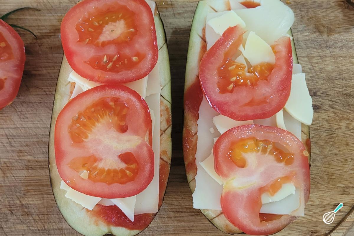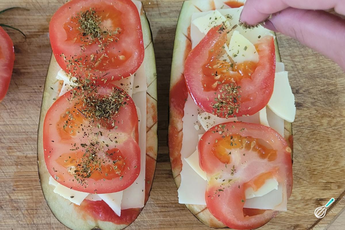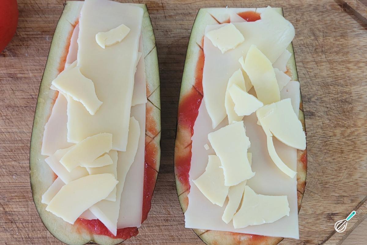 Disponha as fatias de queijo muçarela. Quebre a fatia de queijo provolone e distribua por cima da muçarela nas duas metades da berinjela.