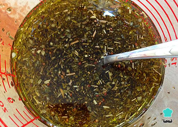 Num recipiente misture os ingredientes do tempero para os legumes: o azeite de oliva, o vinagre, o orégano, a pimenta calabresa, a salsinha, o açúcar e os alhos. Ligue o forno a 180ºC.