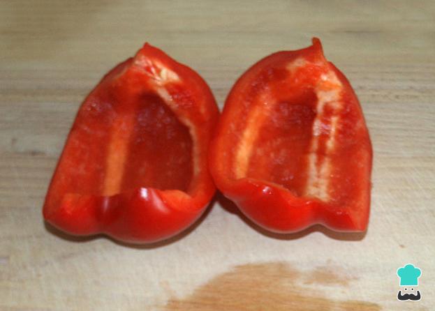 Em seguida limpe os legumes cortando-lhes os topos e retirando as sementes e o filamento branco do interior do pimentão. Corte a berinjela em fatias longas e o pimentão em 4 partes.