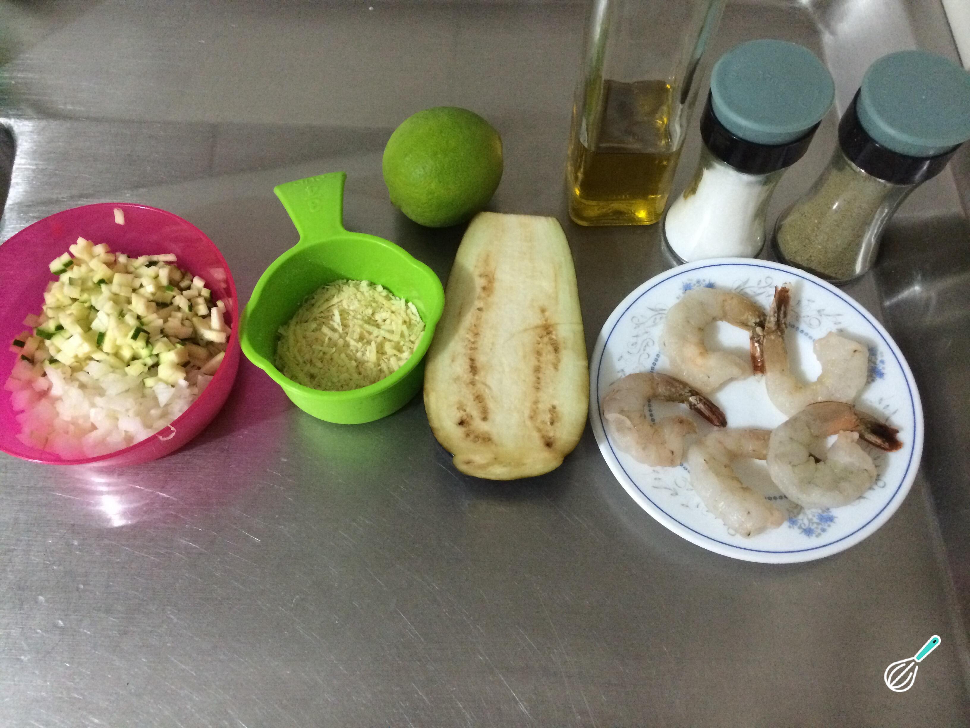 Antes de começar preparando esta receita de berinjela recheada com camarão, o primeiro passo é juntar todos os ingredientes.
