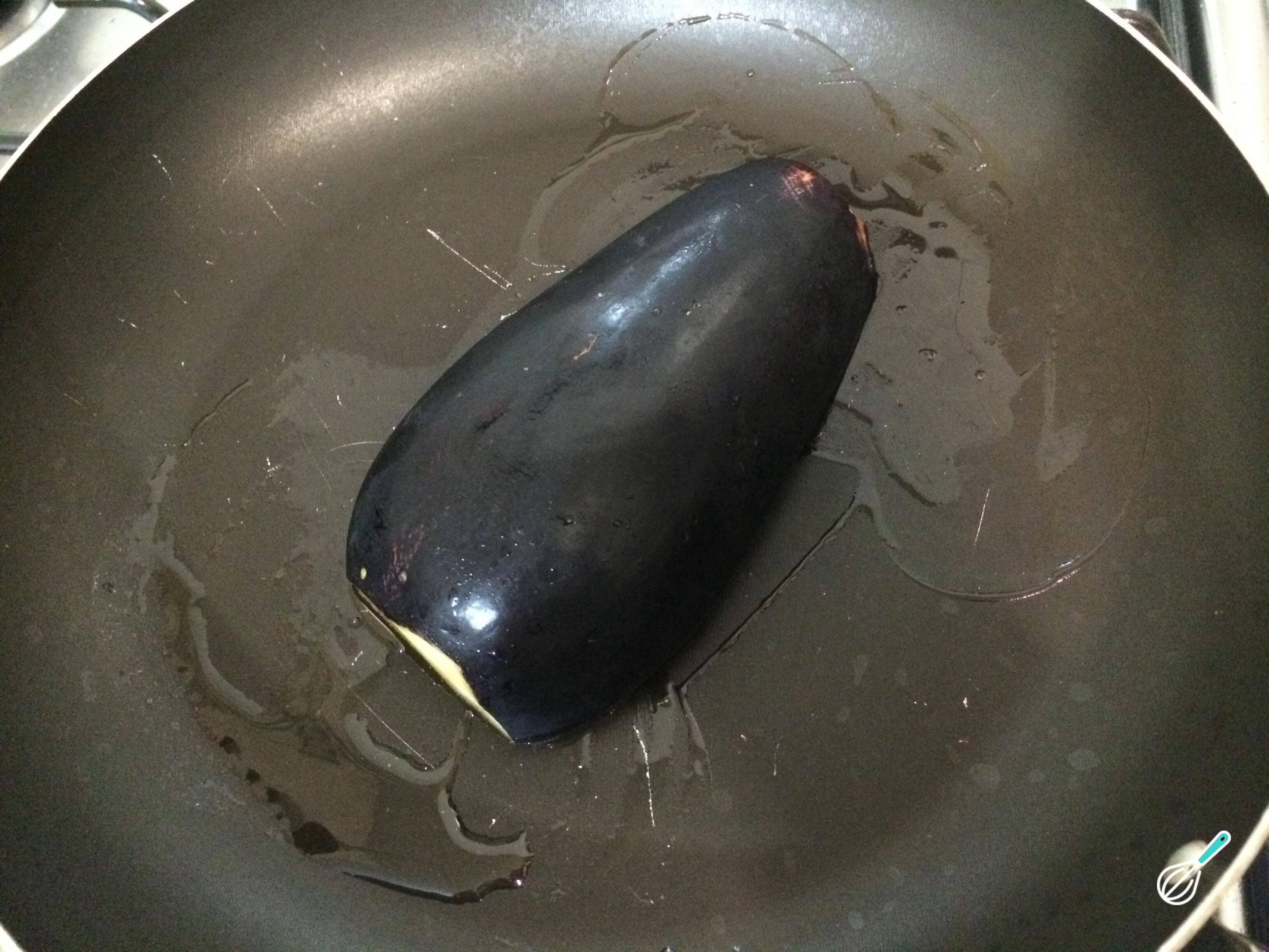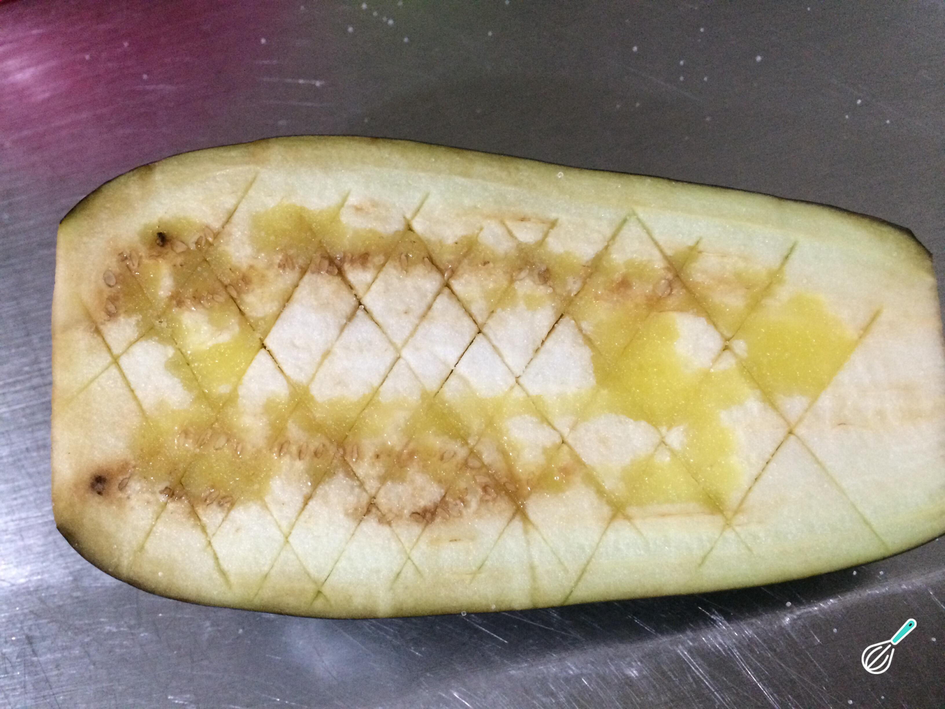 Com uma faca, faça um cortes superficiais no interior das berinjelas cortadas em metades, para que cozinhem mais depressa. Tempere com sal e azeite de oliva.