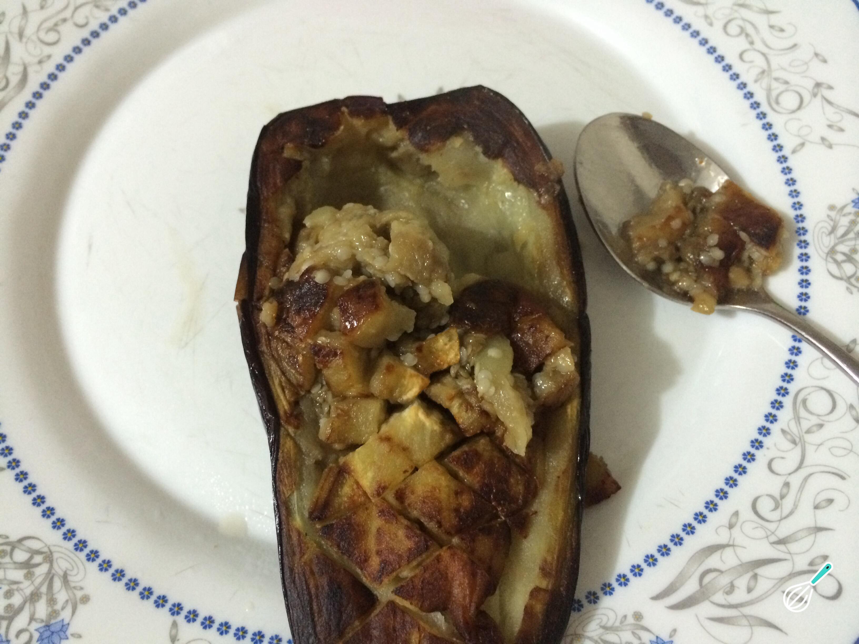 Recheie a berinjela com o preparado anterior e cubra com queijo parmesão. Leve ao forno preaquecido a 200ºC por 10-15 minutos, ou até o queijo dourar.