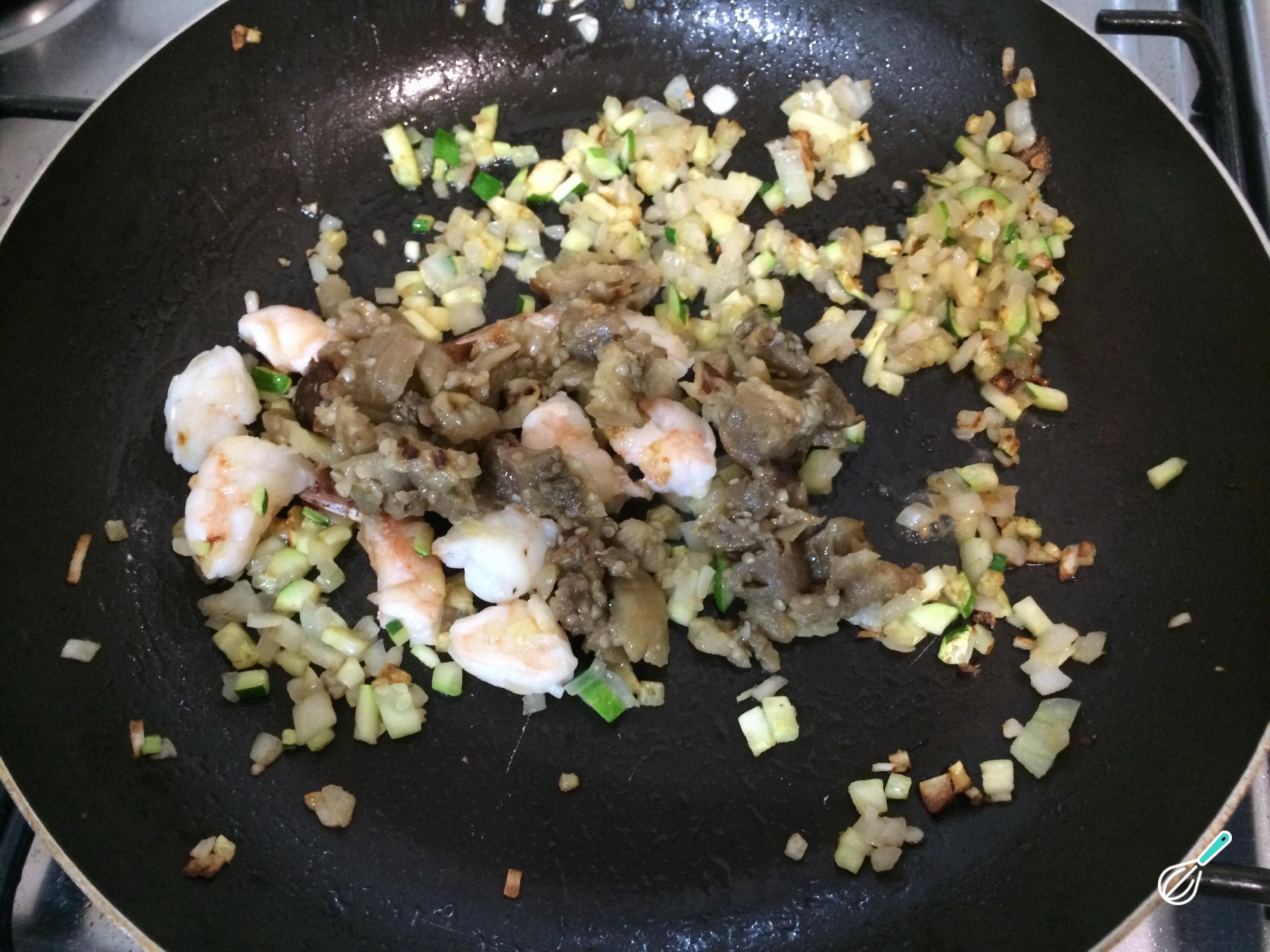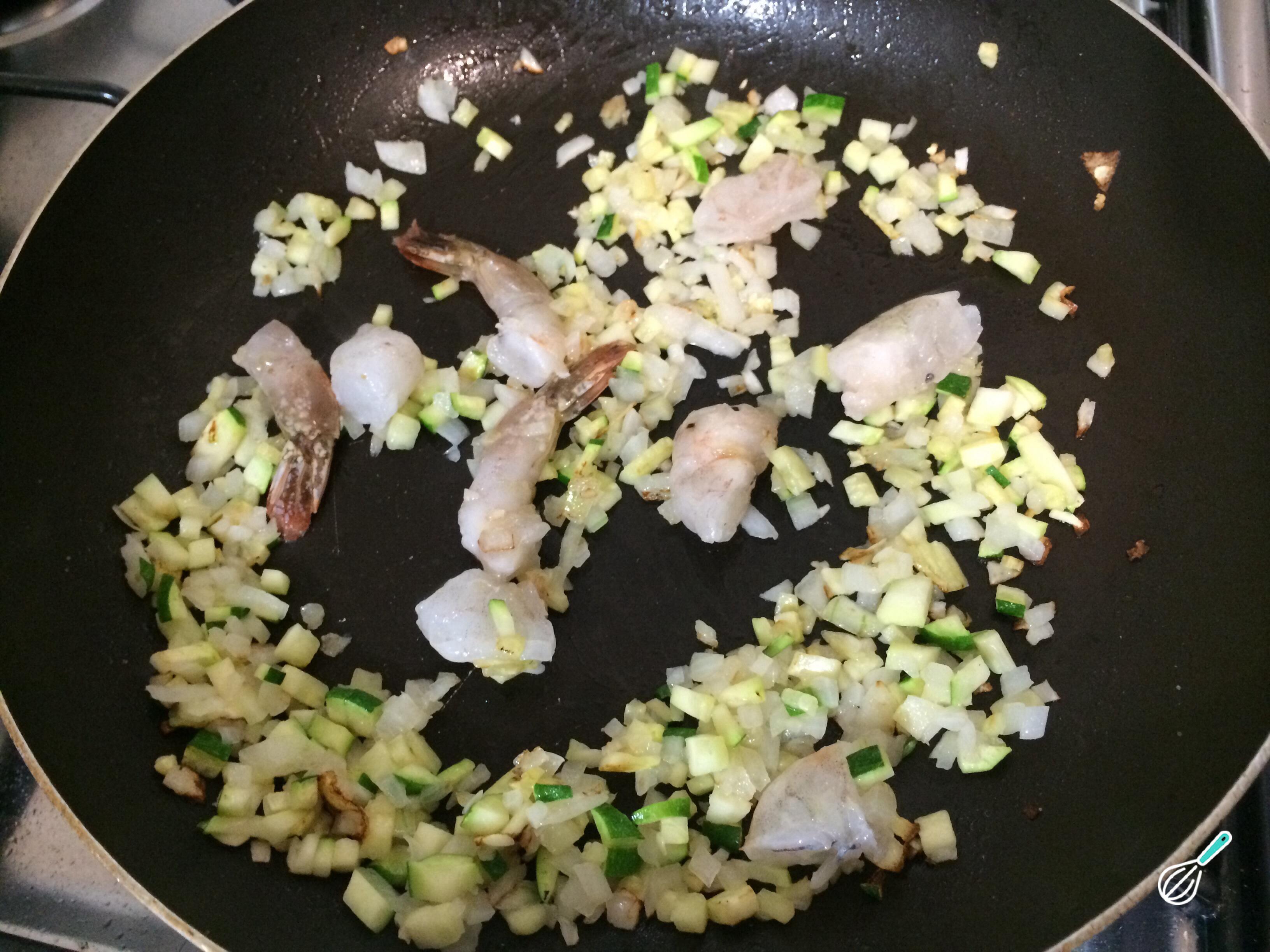 Na mesma panela onde cozinhou a berinjela, adicione um pouco mais de azeite e refogue a cebola com a abobrinha, até que fiquem macias. Acrescente os camarões cortados em pedaços, tempere com sal, pimenta e algumas gotas de limão, e cozinhe por 3 minutos.