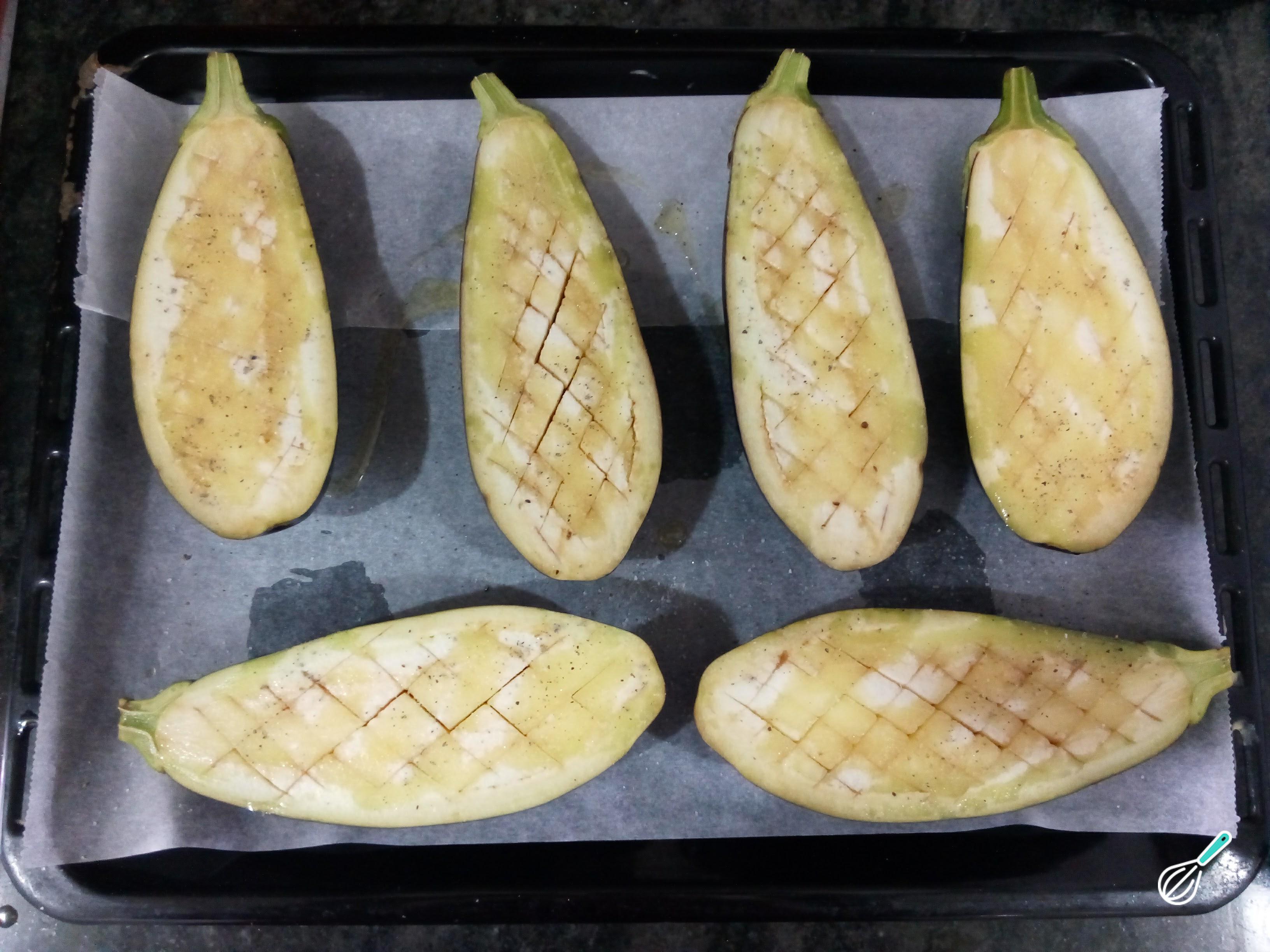 O primeiro passo dessa receita de berinjela com carne moída é lavar e cortar as berinjelas ao meio, depois fazer uns cortes em diagonal na polpa, temperar com sal e pimenta e regar com um pouco de azeite. Coloque em uma forma e leve para assar a 200ºC por 30-40 minutos, ou até que fiquem bem macias.