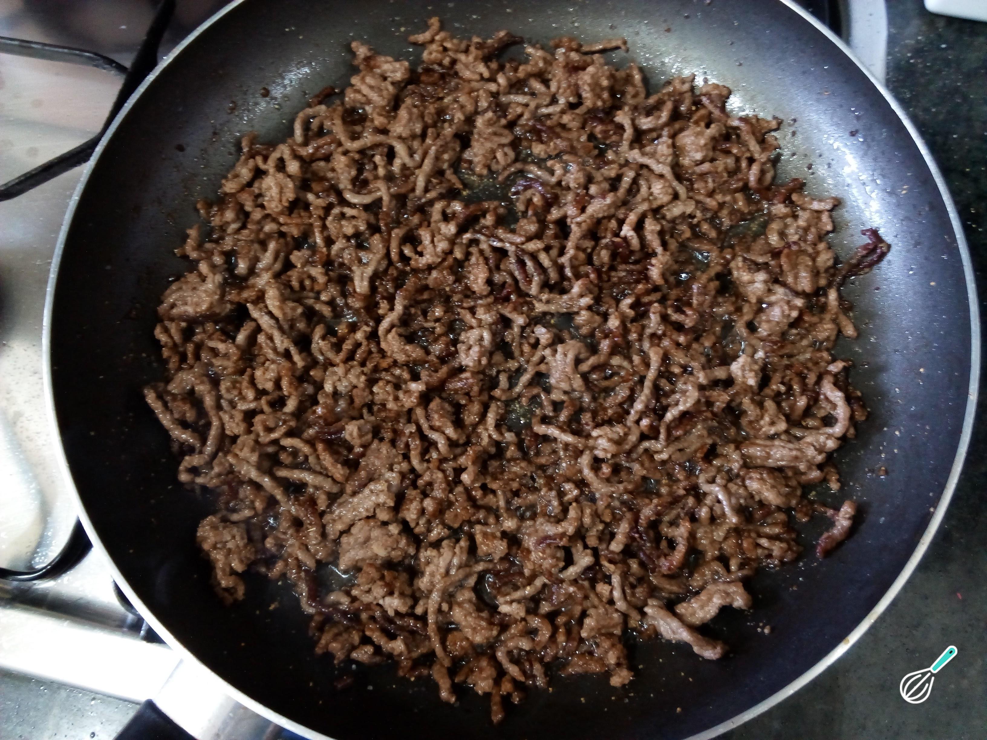 Enquanto isso faça a carne em uma frigideira com um pouco de azeite. Tempere com sal e pimenta a gosto e, se quiser, acrescente também alho em pó ou outro tempero.