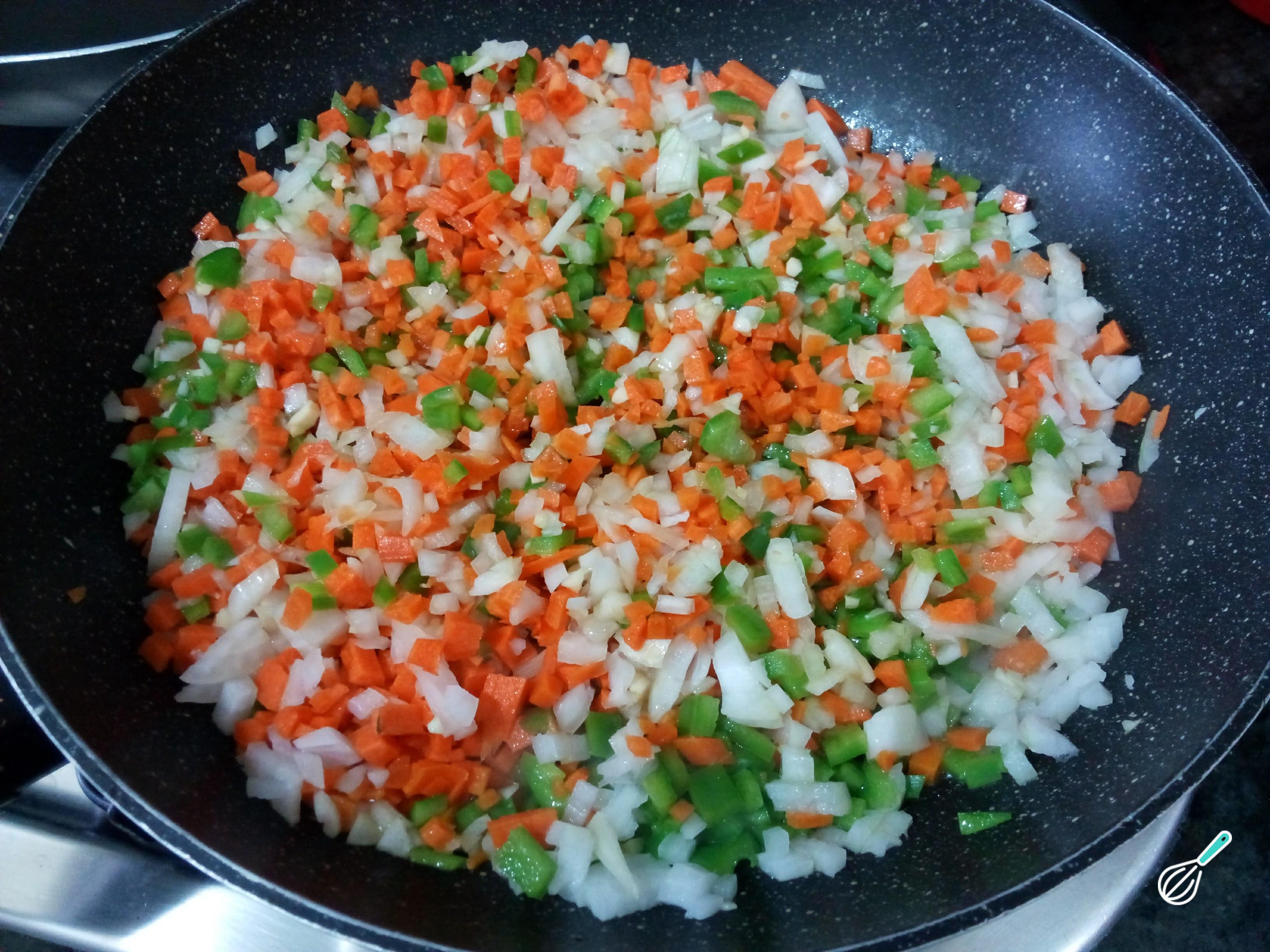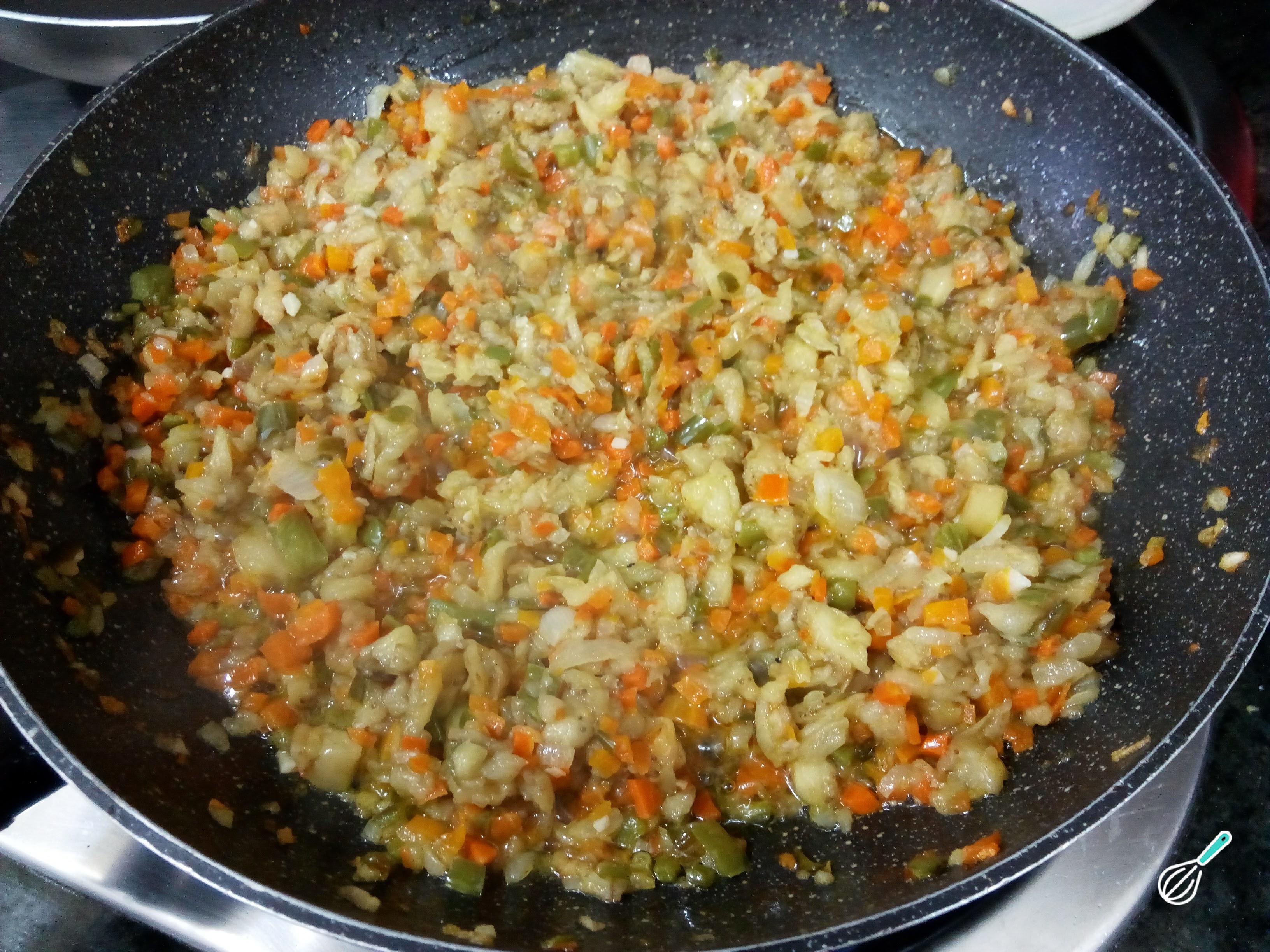 Na mesma frigideira da carne, para aproveitar seu sabor, cozinhe os legumes bem picadinhos (a cebola, a cenoura e o pimentão) até ficarem macios. Tempere também com sal e pimenta.