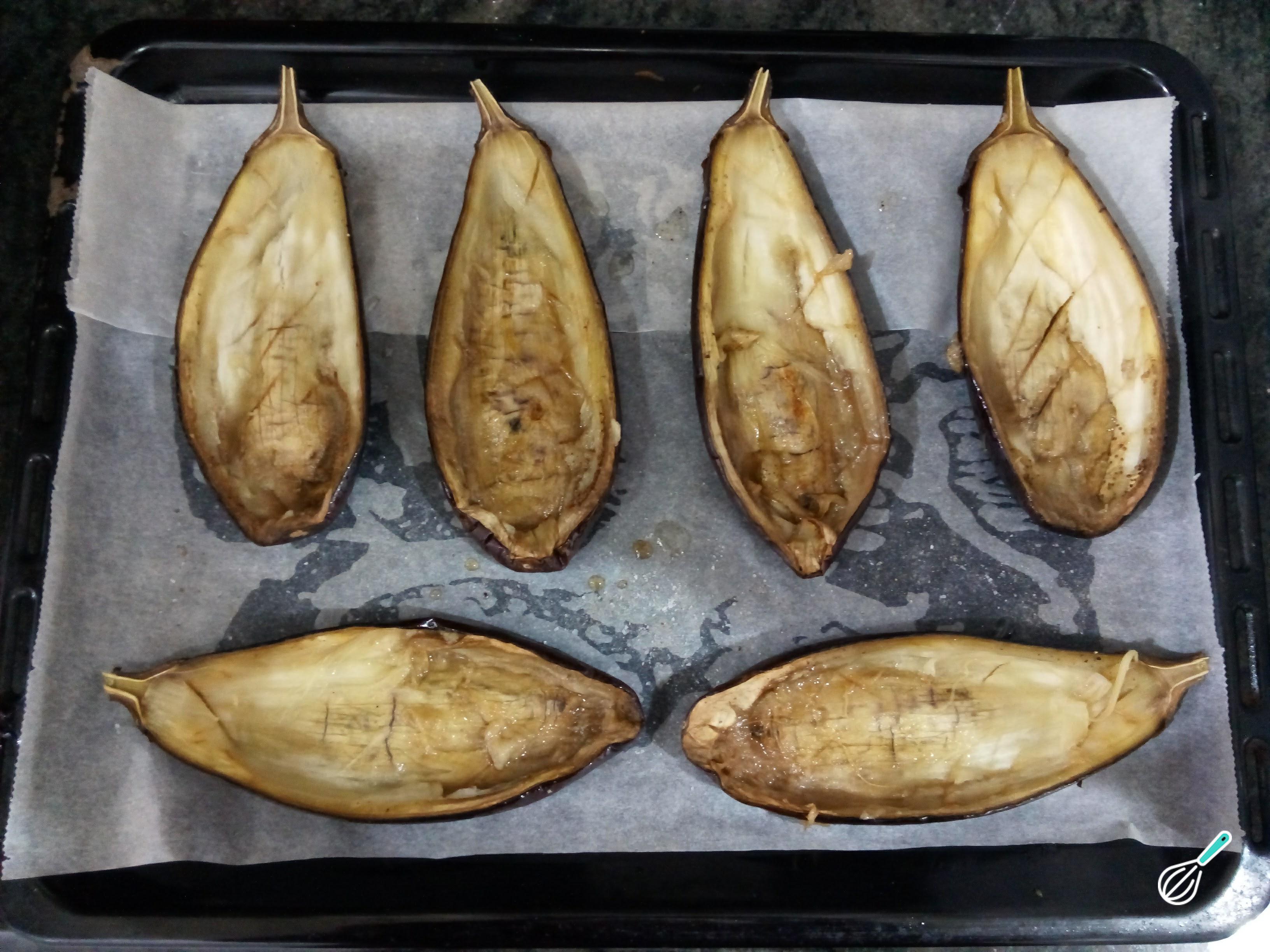 Assim que as berinjelas estiverem assadas, retire do forno e, com a ajuda de uma colher, retire a polpa delas sem quebrar a casca.
