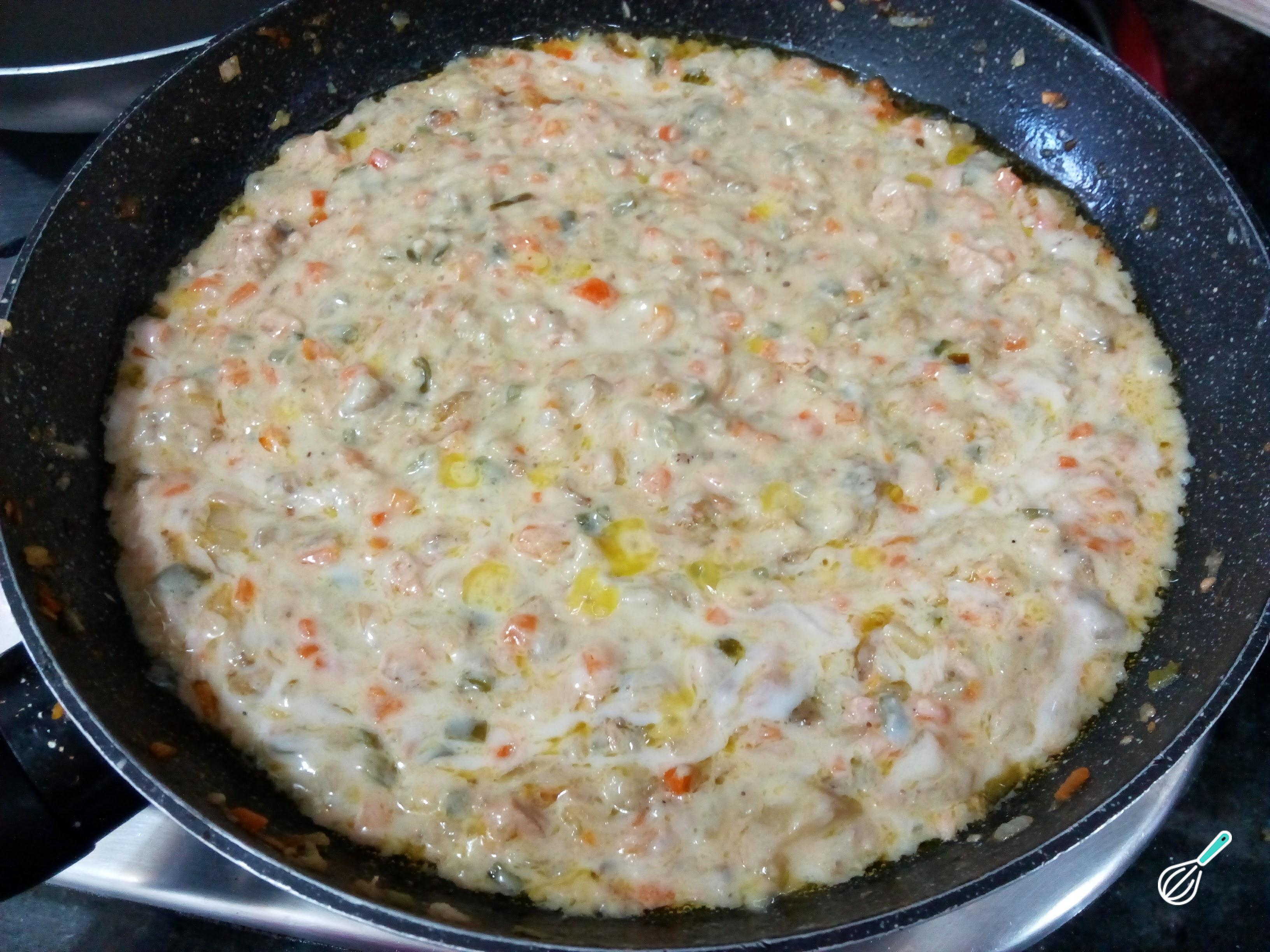 Acrescente também o molho branco ao recheio e cozinhe por mais 1-2 minutos, para integrar todos os sabores.