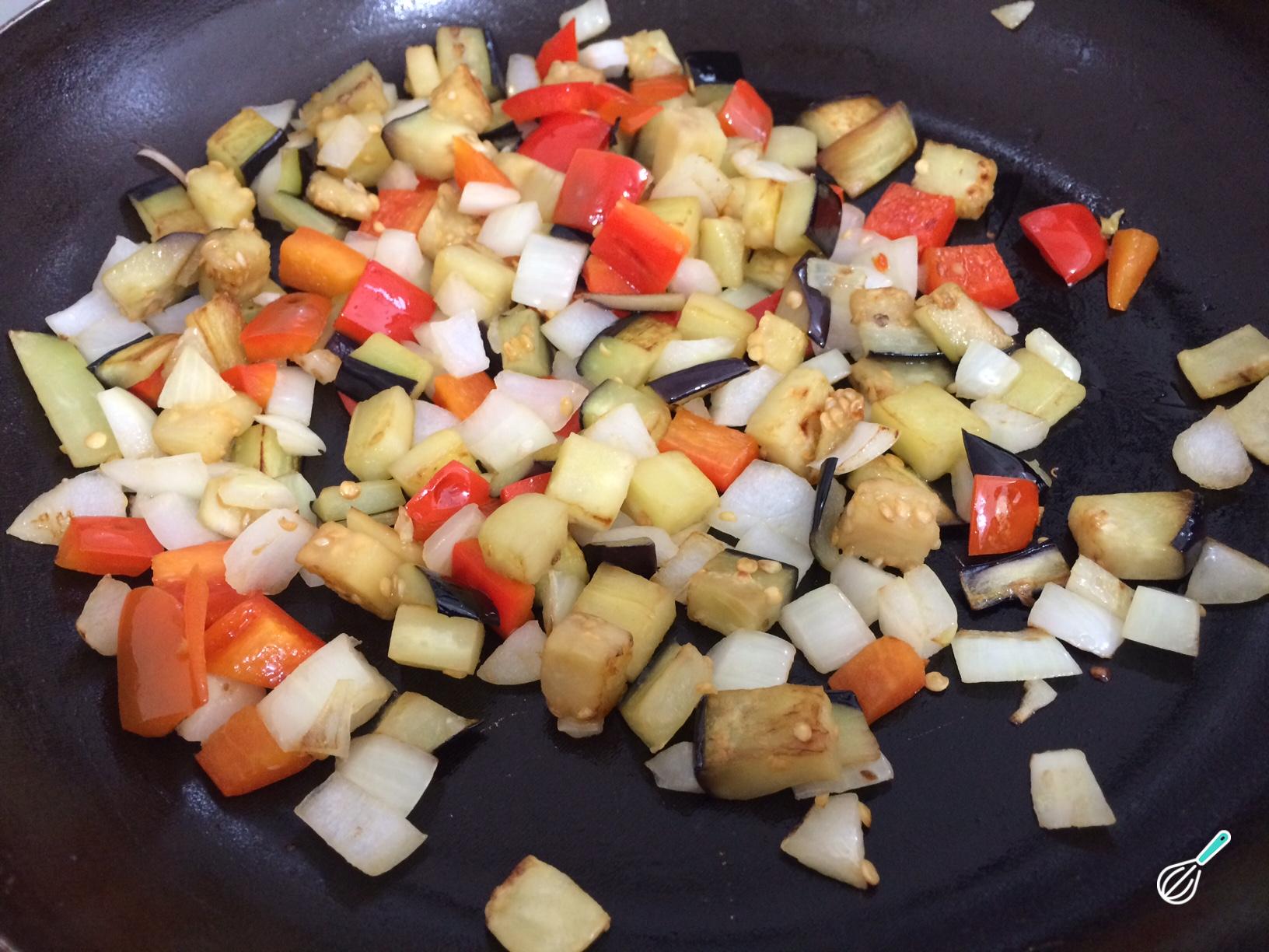 De seguida, junte a berinjela, o pimentão, o tomate, a cebola, o molho inglês, a mostarda, o ketchup, o orégano e a água. Deixe cozinhar em fogo baixo até os ingredientes cozerem e ficarem macios. Junte as passas e misture no molho.