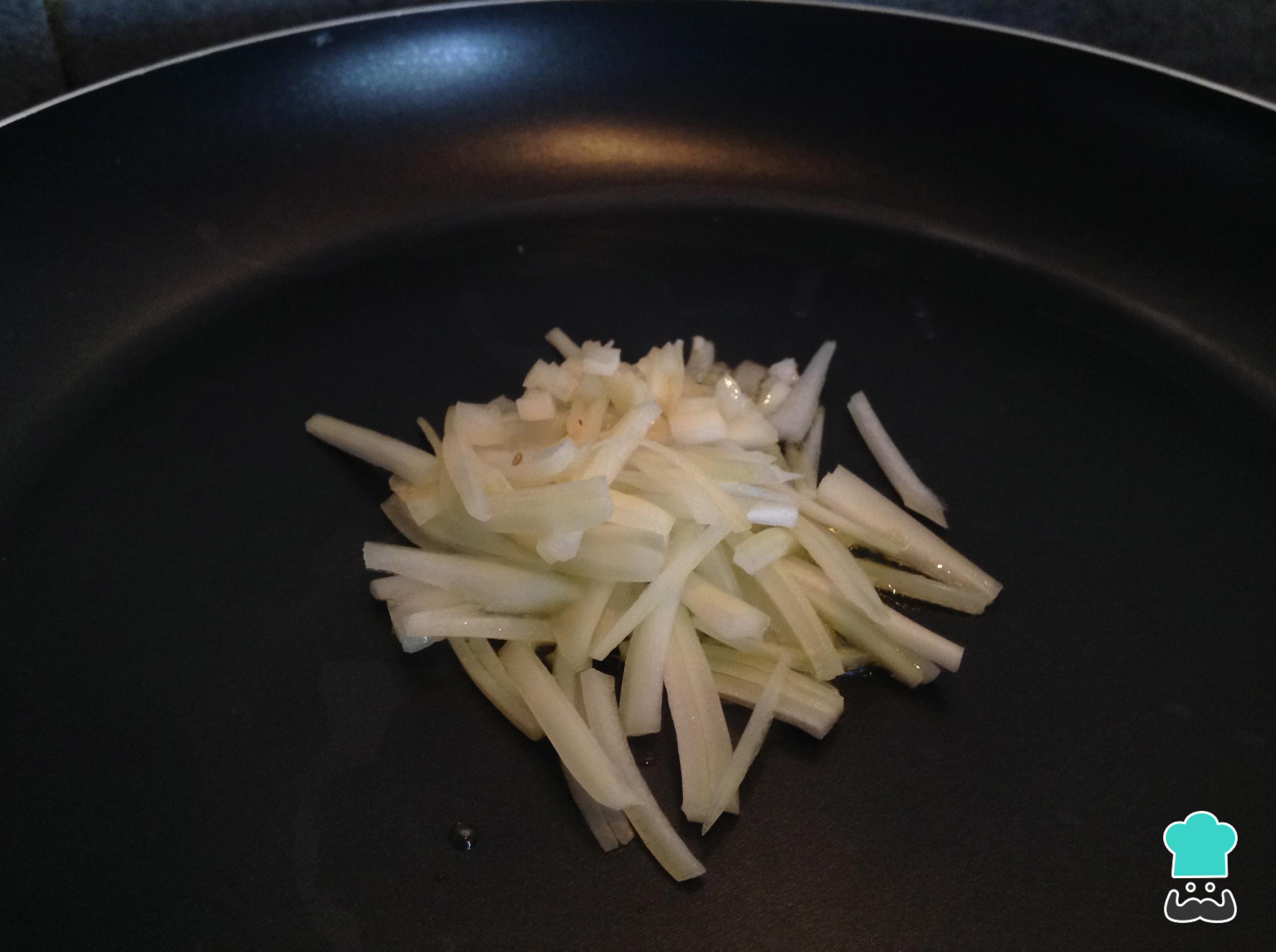 Leve uma frigideira ao fogo médio com um pouco de óleo de girassol e acrescente a cebola. Refogue até ficar macia.