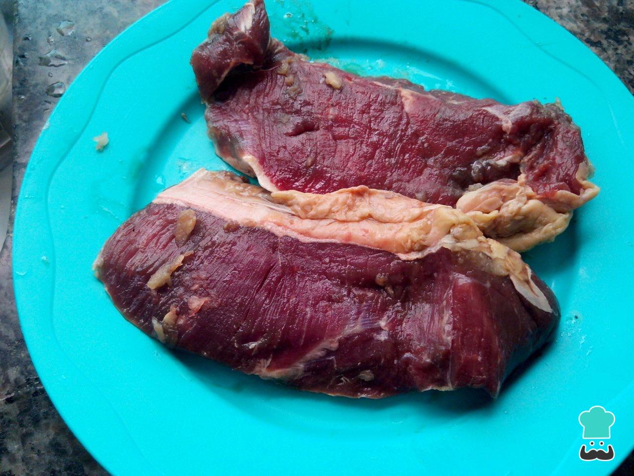Para fazer esta receita de bife empanado com farinha de amêndoas tempere a carne com o alho e sal a gosto. Se os bifes tiverem muita gordura também será melhor retirar parte dela.
