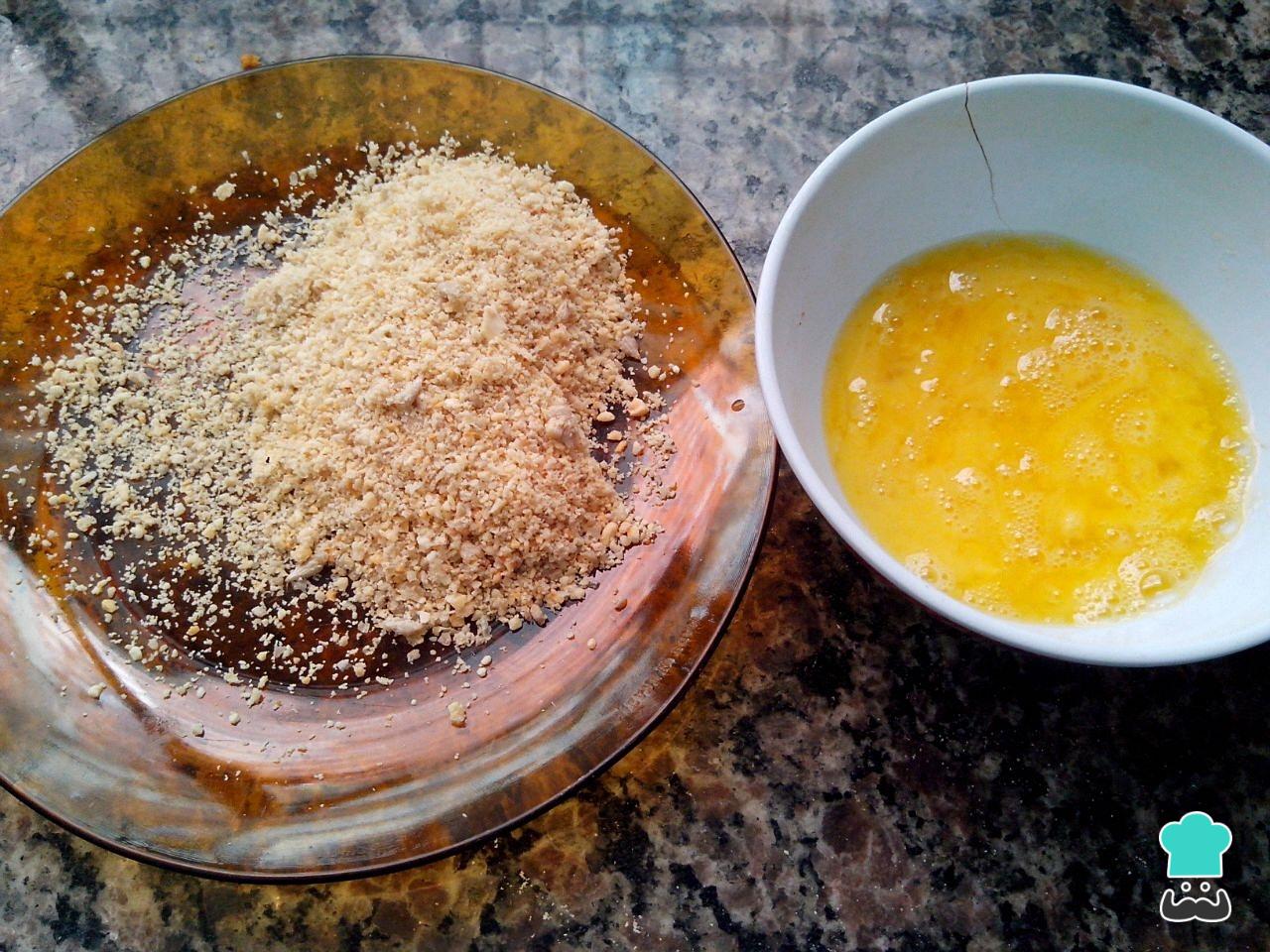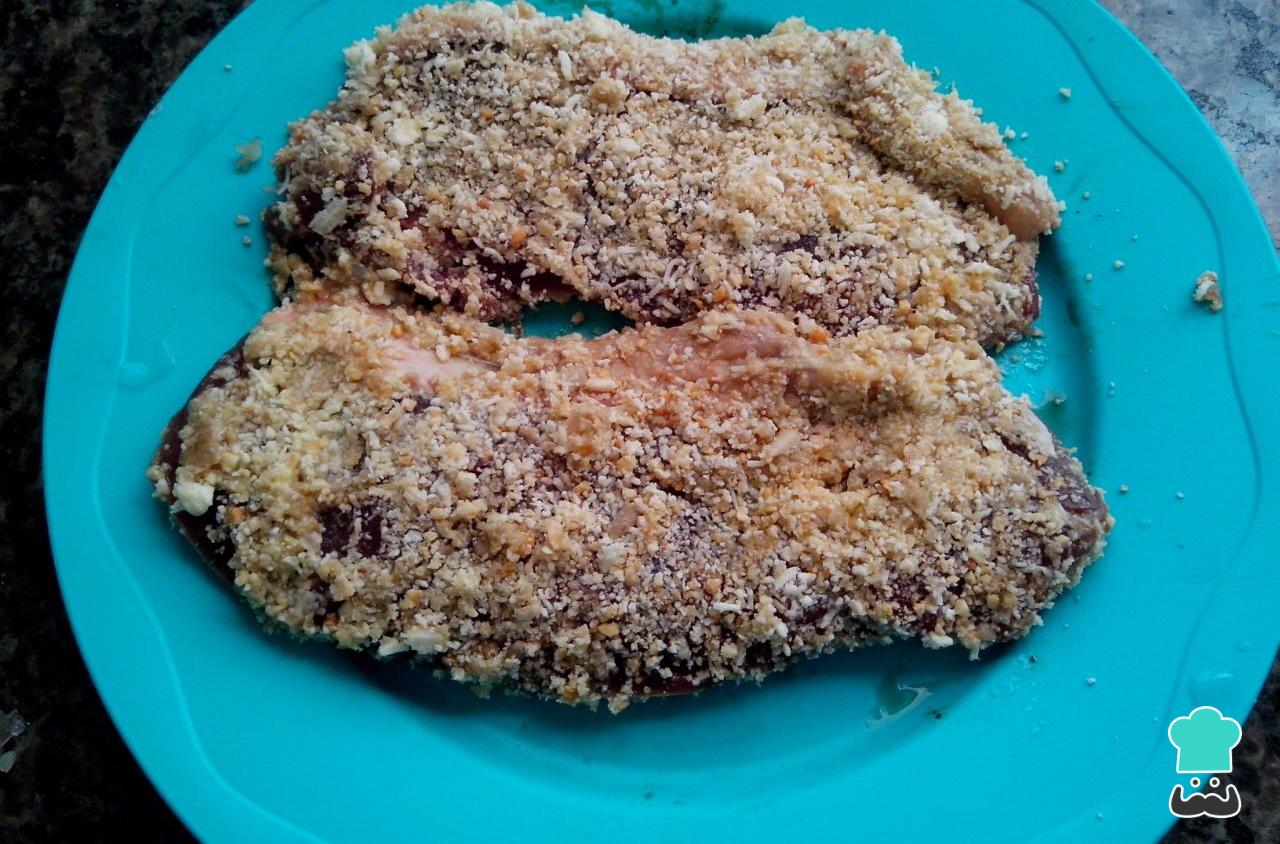 Em seguida, em um recipiente, bata no garfo o ovo. Em um prato misture a farinha com o queijo ralado. Estes são os ingredientes que iremos usar para empanar a carne.