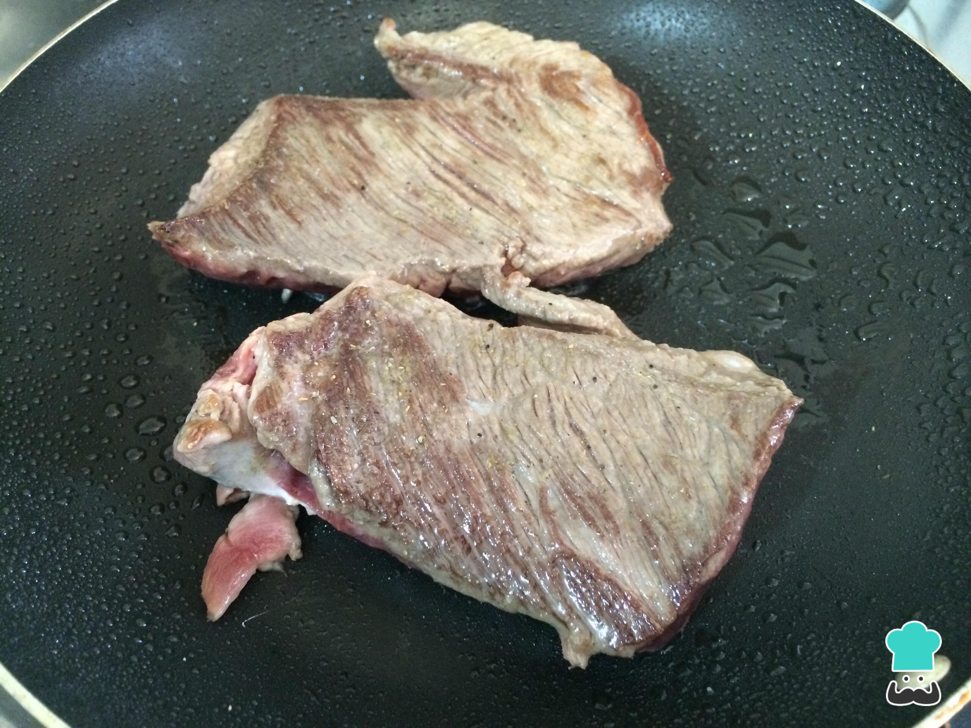 Em uma frigideira com óleo, cozinhe em fogo médio a carne previamente temperada com sal e pimenta, até que esteja do seu agrado. Quando estiver pronta, retire da frigideira e deixe repousar, cortada em fatias, em um prato para que os sucos assentem.