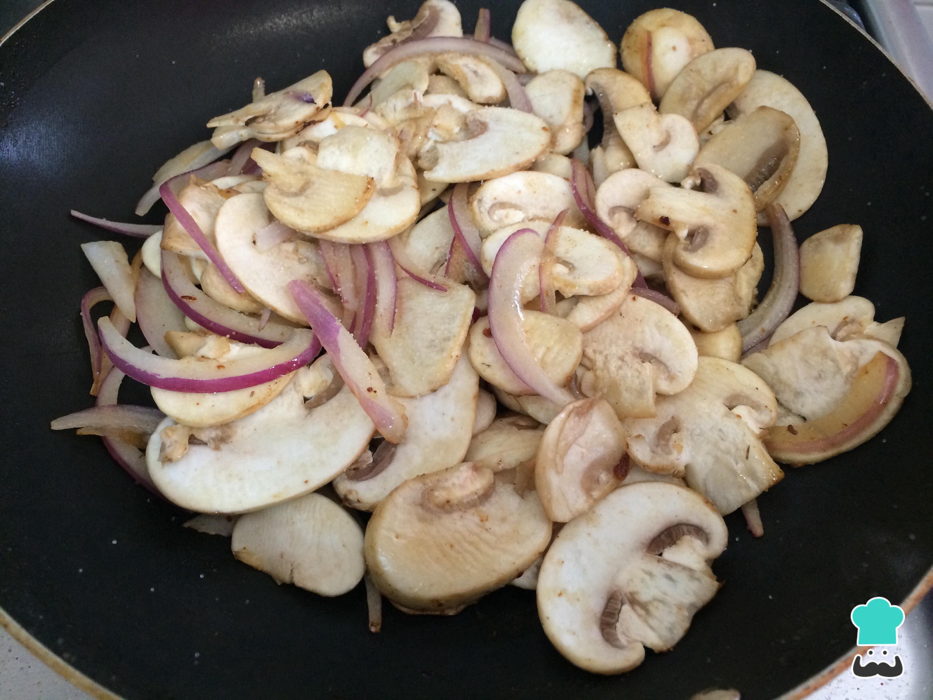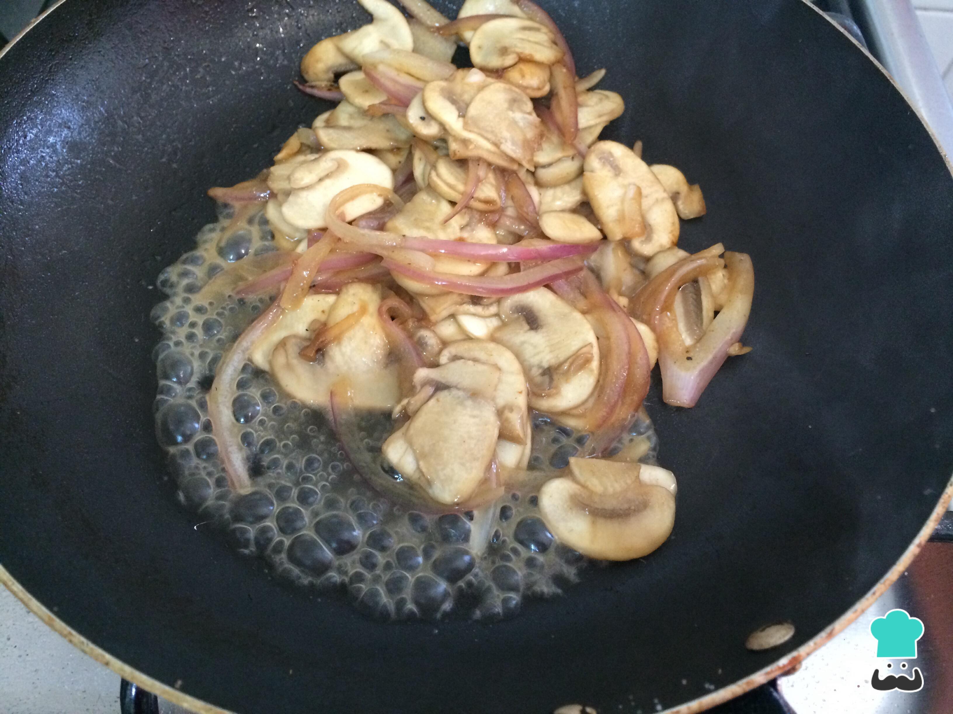 Continue preparando esta receita de bife com molho de cogumelos: na mesma frigideira, desta vez com a manteiga, refogue a cebola cortada em pétalas e cogumelos, ambos temperados com sal e pimenta, até que estejam dourados.