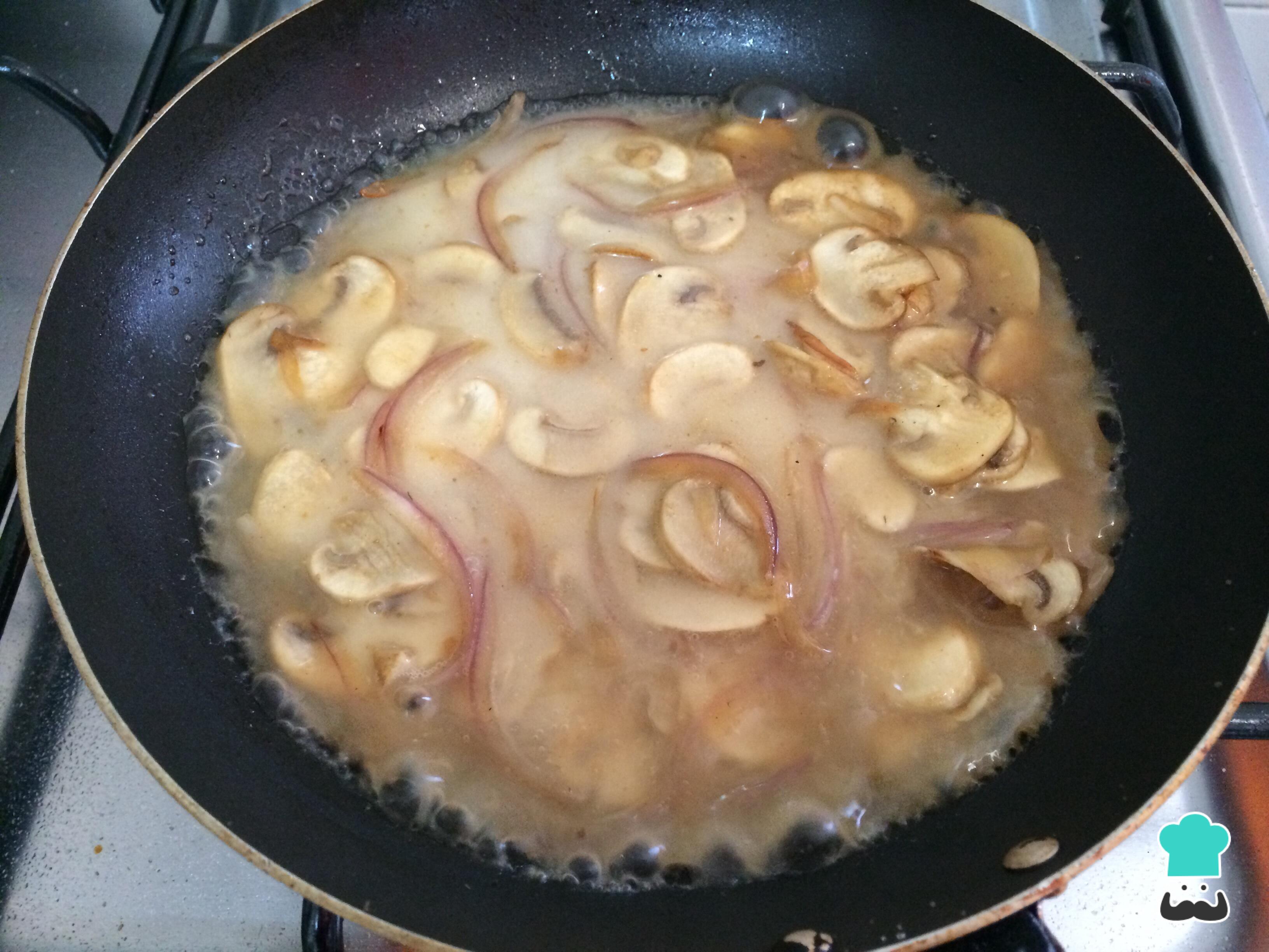 O próximo passo do bife com molho de cogumelos é, em uma tigela, dissolver o amido de milho com meia xícara de água fria. Adicione à frigideira e misture até que se torne espesso.