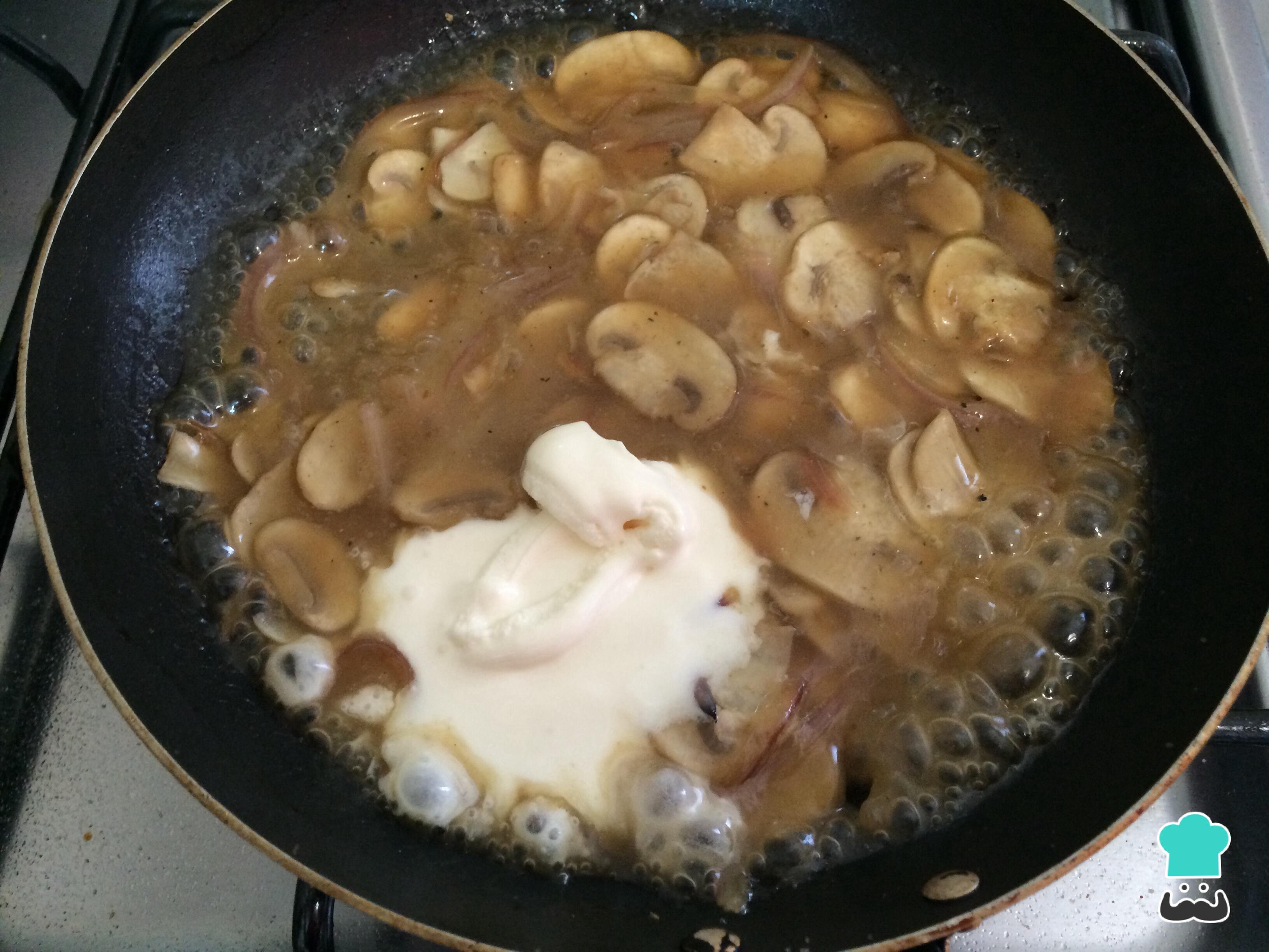 Finalmente, para terminar de preparar o molho de cogumelos, acrescente o creme de leite e misture. Corrija o sabor com sal e pimenta.
