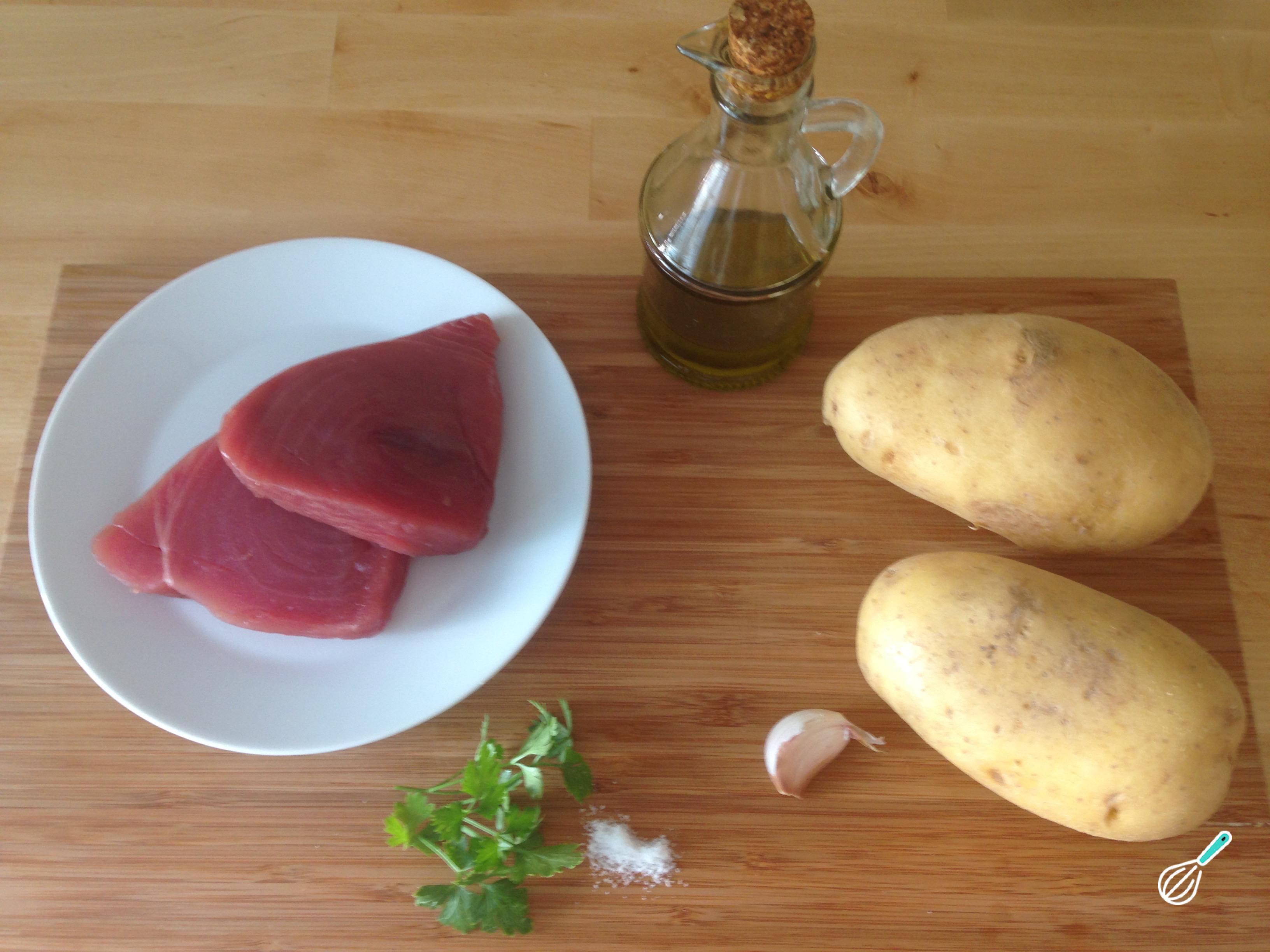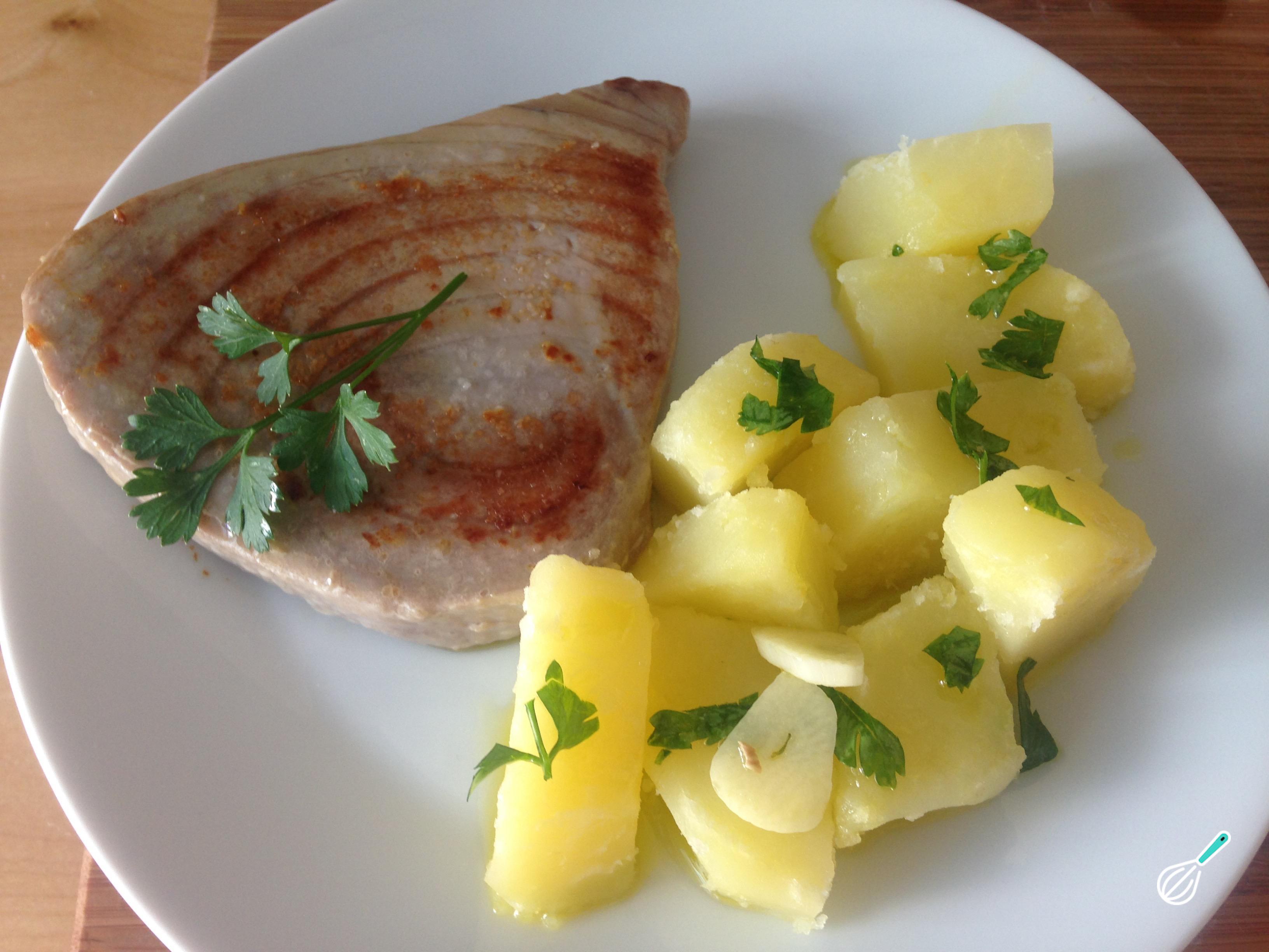 Sirva o bife de atum na chapa acompanhado das batatas temperadas e um pouco de salsinha. Está pronto a comer!