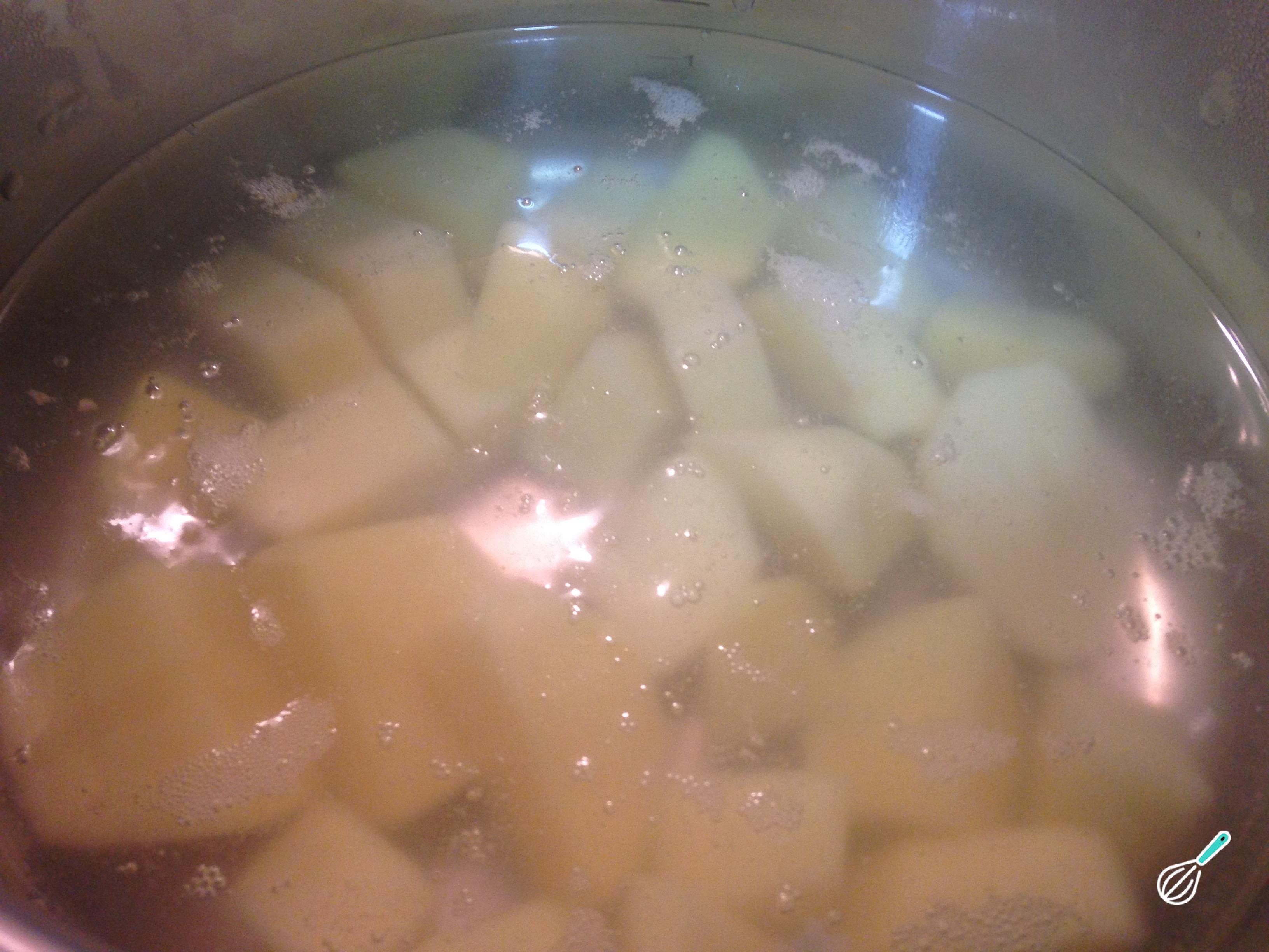 Cozinhe as batatas descascadas e cortadas em uma panela com água fervente até ficarem macias.