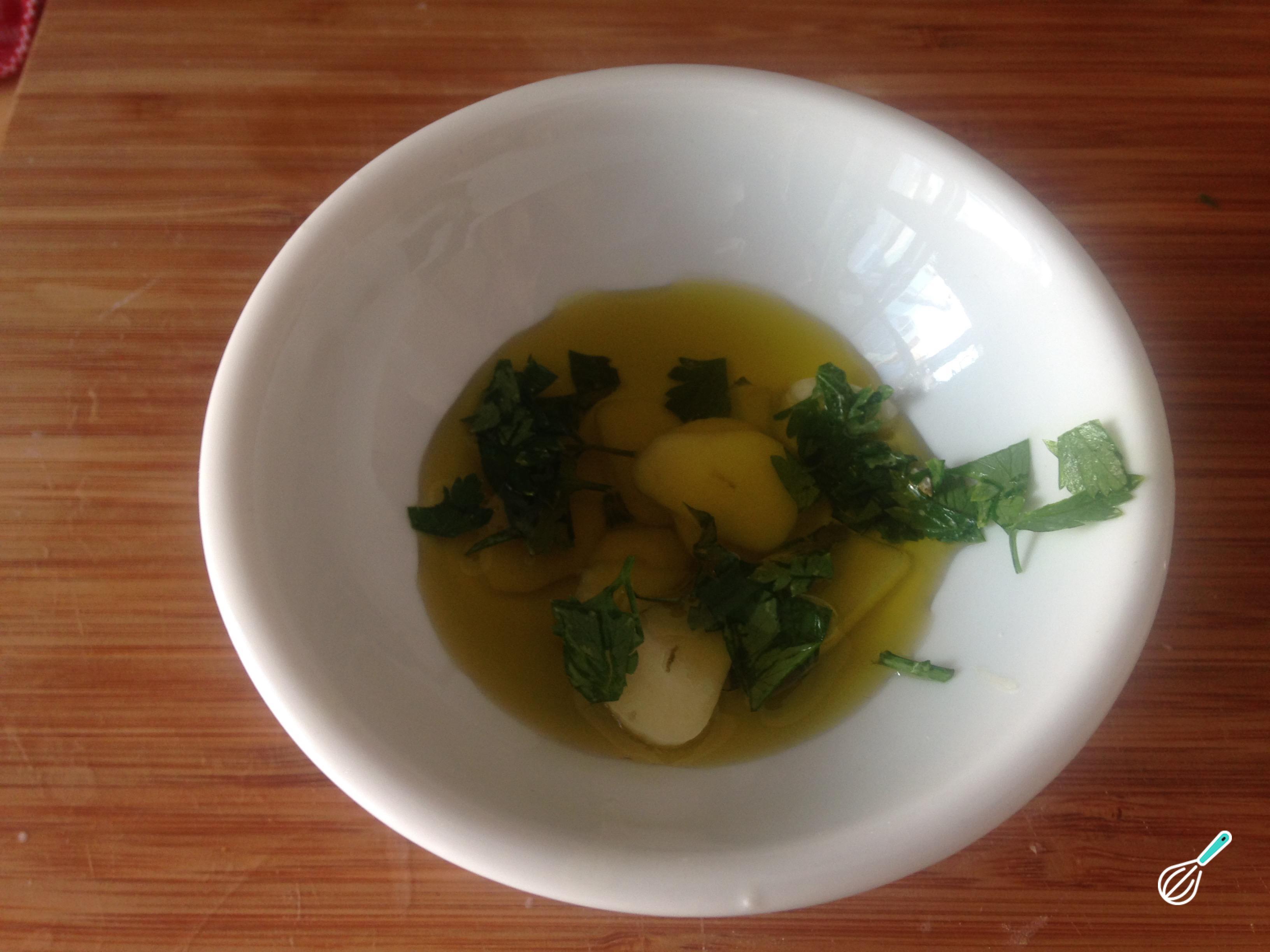 Marine o alho e salsinha picados em uma tigela com azeite.